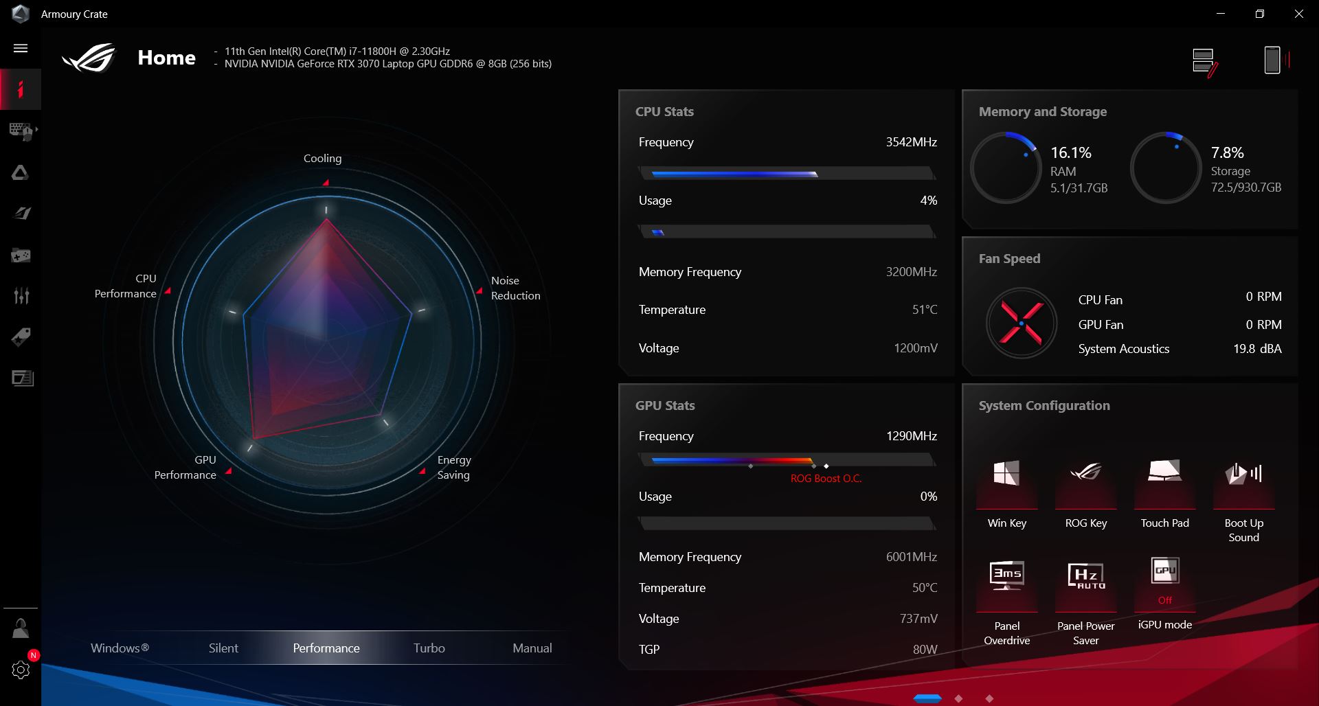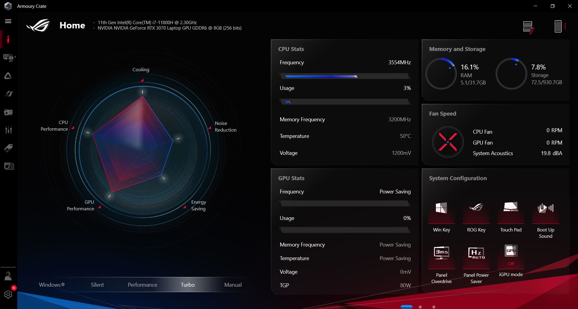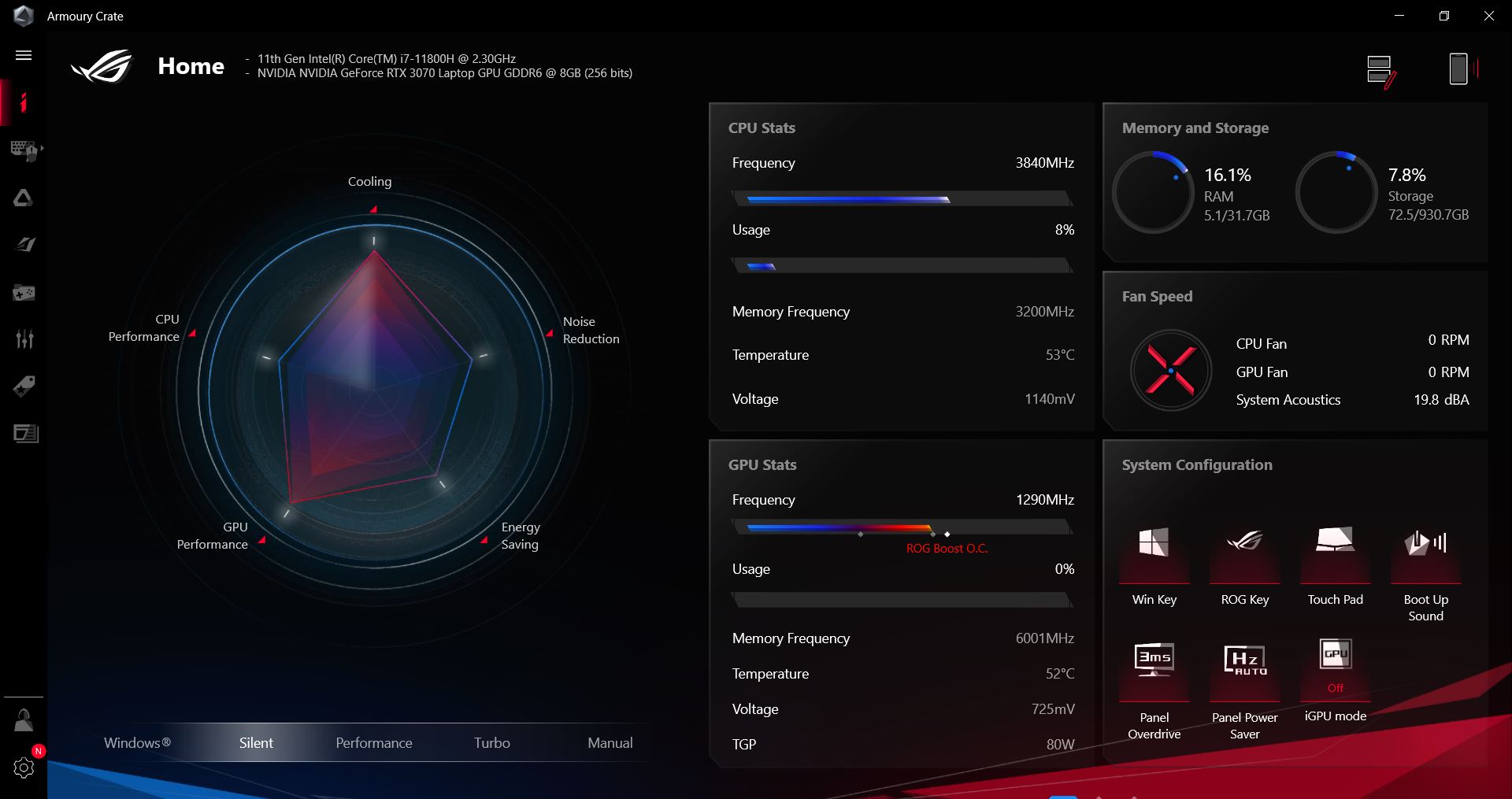 W spoczynku laptop był bezgłośny, ale jak tylko coś się na nim robiło to włączały się wentylatory i z odległości 20 cm głośność wynosiła ok. 39,2 dBA. Słychać więc szum, który może przeszkadzać. Jednakże możecie zawsze się przełączyć w tryb Silent, gdzie Asus ROG Zephyrus M16 GU603 będzie przez większość czasu bezgłośny. Pod obciążeniem w trybie Turbo jest już bardzo głośno – 55,4 dBA to naprawdę wysoki wynik. Tutaj polecam zainwestowanie w słuchawki, które dobrze wygłuszą pracę sprzętu.