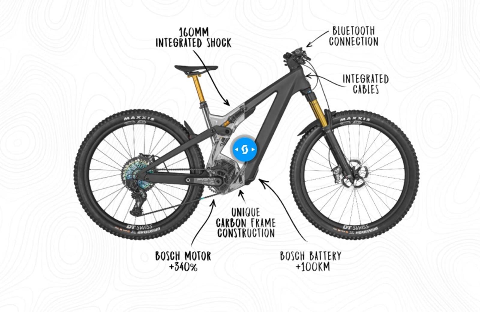 Ta rama jest zresztą miejscem ukrycia zarówno prowadzonego wewnętrznie okablowania, jak i zaawansowanego układy napędowego. Obok 12-biegowej przerzutki tylnej SRAM X01-GX Eagle, składa się na niego, umieszczony między korbami, silnik Bosch Performance CX, zapewniający 85 Nm momentu obrotowego. Ten czerpie zasilanie z 750-Wh demontowanego akumulatora Bosch PowerTube ukrytego w dolnej rurze, który zapewnia wspomaganie do 100 km na jednym ładowaniu.