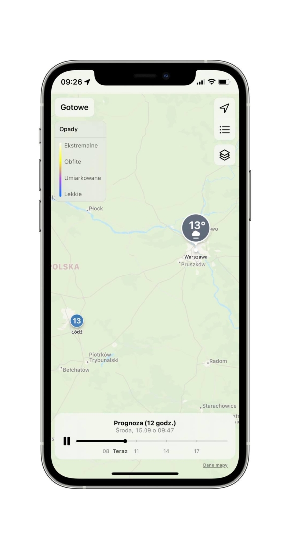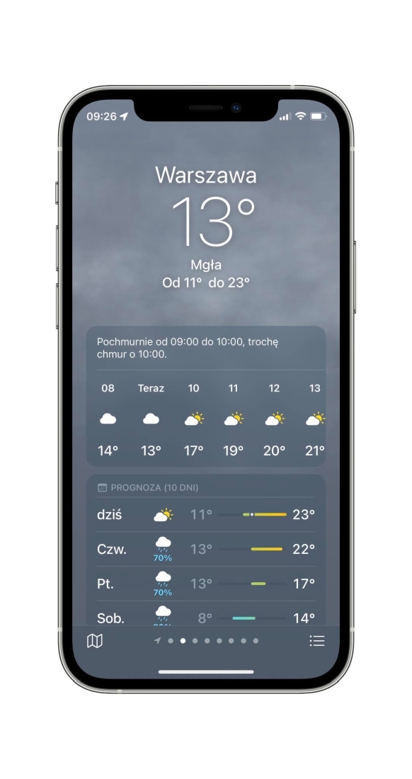 Apple przeprojektowało całkowicie natywną aplikację pogodową. To zasługa przejęcia wcześniej przez Apple start-upu z własną bardzo rozbudowaną appką. Teraz natywna aplikacja oferuje bardzo szczegółowe dane pogodowe podane w przyjazny sposób. Stylistycznie nawiązuje ona do poprzednich wersji, jednak zdecydowanie informacje są podane lepiej i jest ich więcej. Rewelacyjnie prezentuje się mapa z wirtualizacją opadów w ciągu kolejnych godzin i w dodatku jest ona dość dokładna.