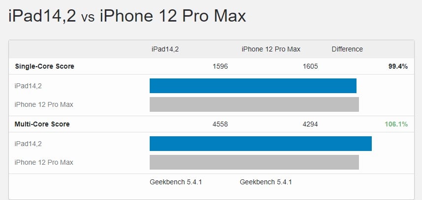 Co po takiej redukcji zostało z obiecanego 50-procentowego wzrostu wydajności CPU? Wprawdzie A15 Bionic w iPadzie Mini 6 pokonał iPhone 12 Max Pro o kolejno 14,9 i 23 procent w teście rozpoznawania mowy i kompresji tekstu, ale w innych testach z udziałem wielu rdzeni różnice wydajności są znikome (ogółem o 6,1%). Starszy układ pokazuje jednak pazur w operacjach jednowątkowych, wyprzedzając A15 Bionic w ogólnym rozrachunku o 0,6%.