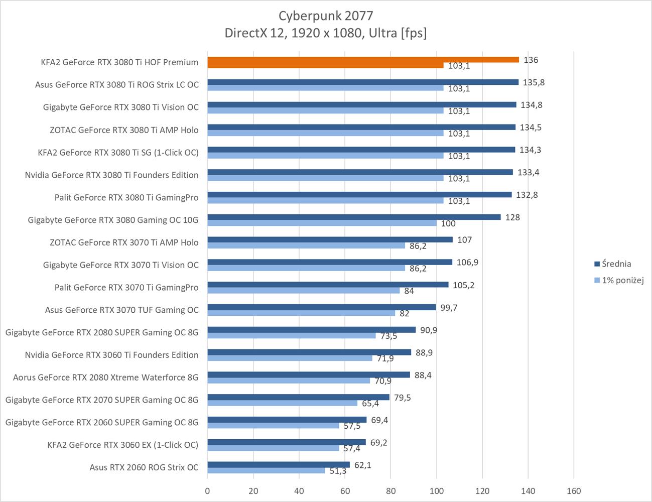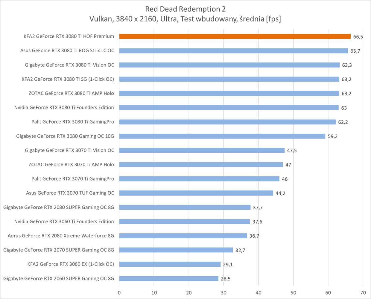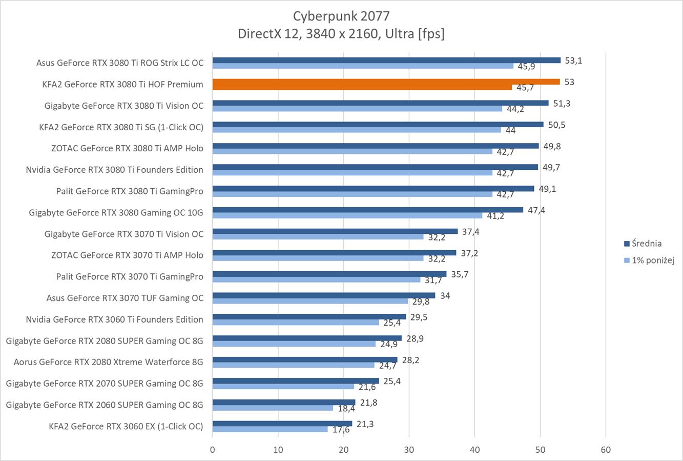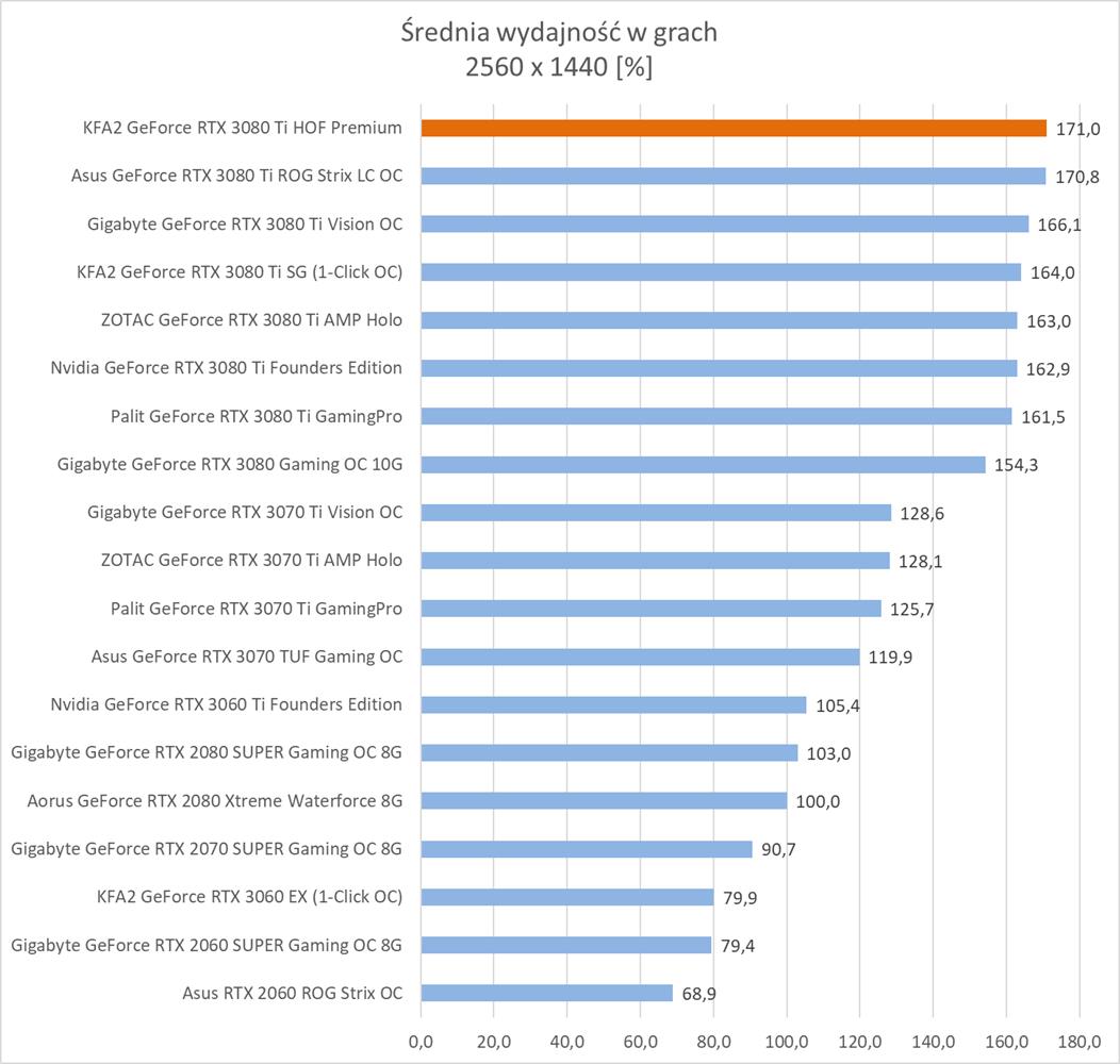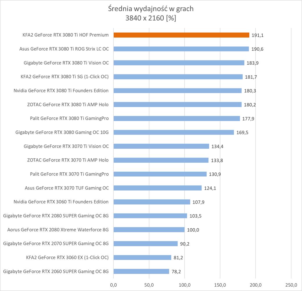 Karta jest bez wątpienia najwydajniejsza w zestawieniu. Przewaga nad modelem Asusa nie jest duża, ale jednak pozwoliła karcie KFA2 na zajęcie pierwszego miejsca na wykresach. Bez wątpienia więc karta świetnie sprawdzi się w rozdzielczości 4K i ciężko będzie o wydajniejszy model RTX 3080 Ti.