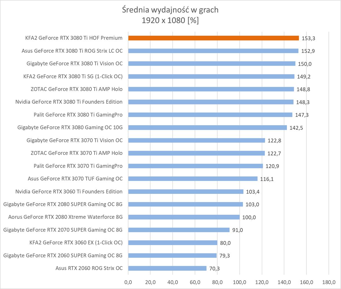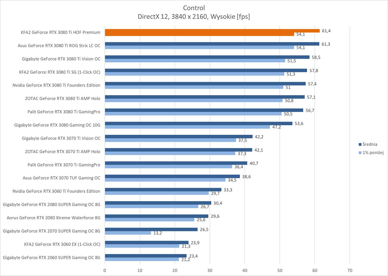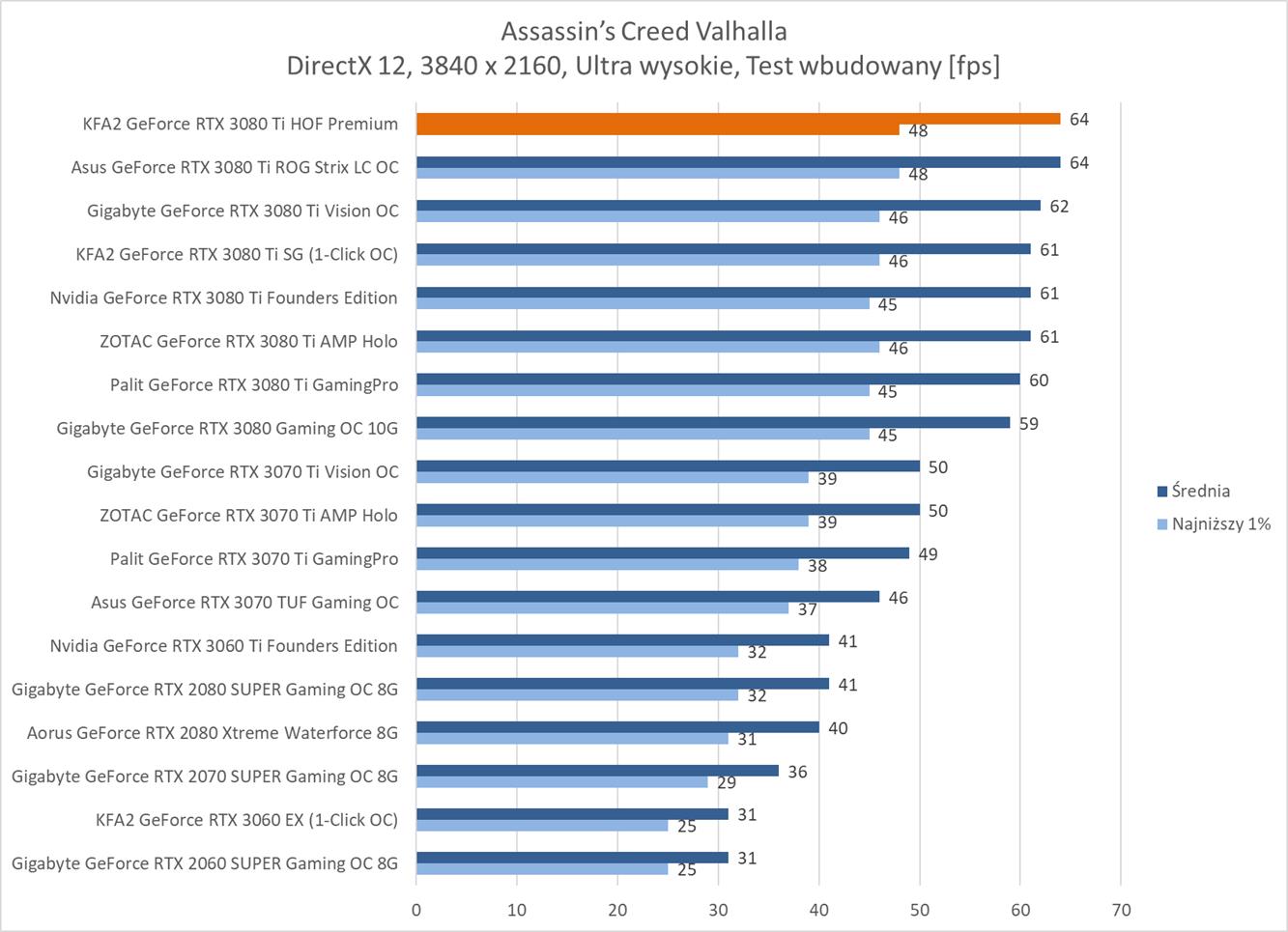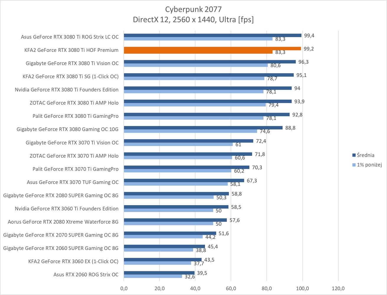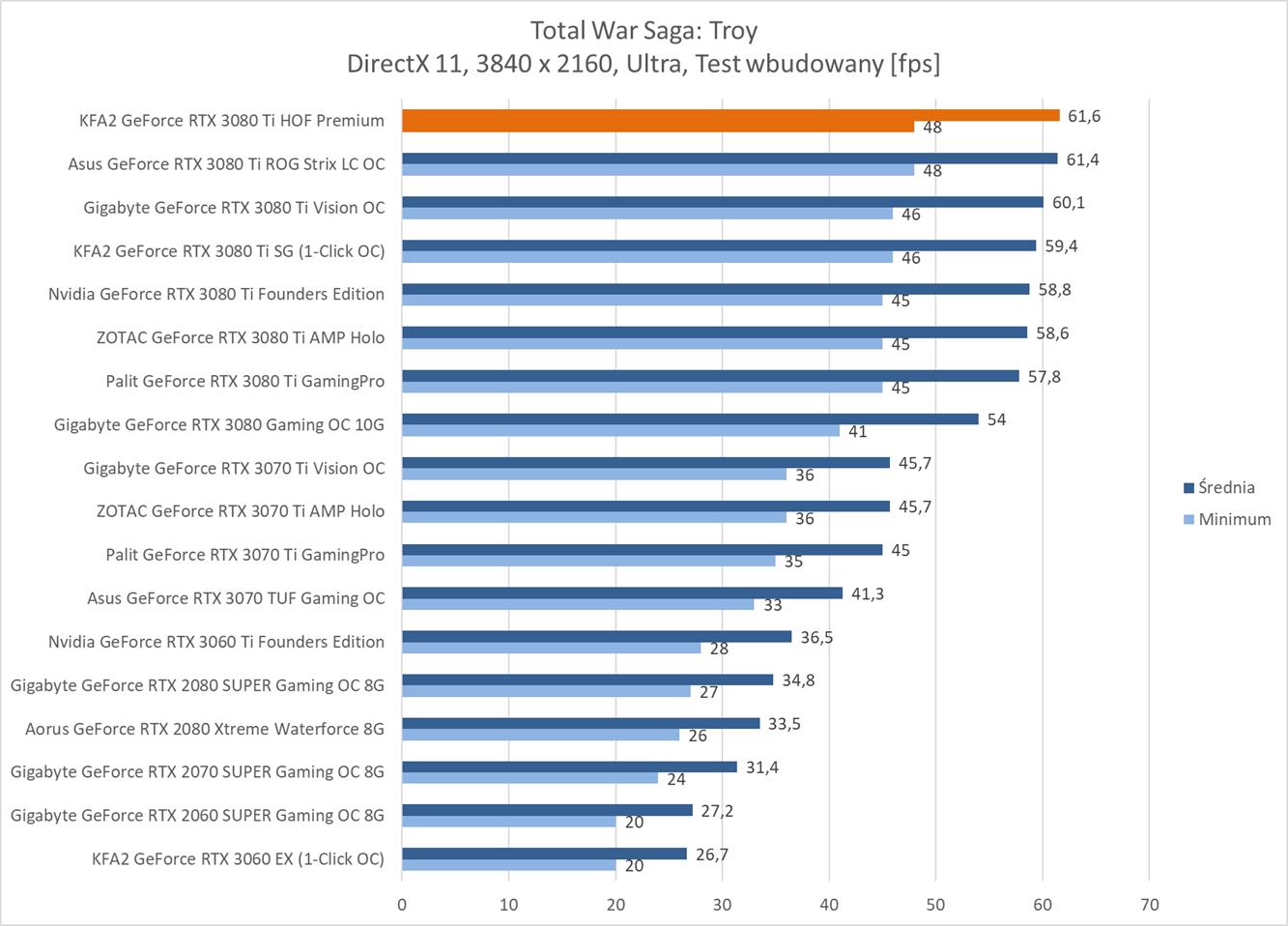 Karta jest bez wątpienia najwydajniejsza w zestawieniu. Przewaga nad modelem Asusa nie jest duża, ale jednak pozwoliła karcie KFA2 na zajęcie pierwszego miejsca na wykresach. Bez wątpienia więc karta świetnie sprawdzi się w rozdzielczości 4K i ciężko będzie o wydajniejszy model RTX 3080 Ti.