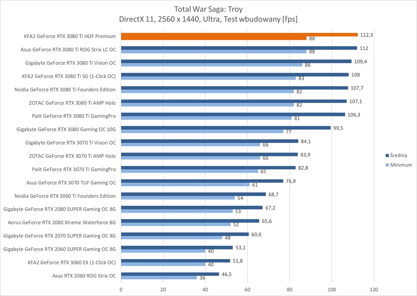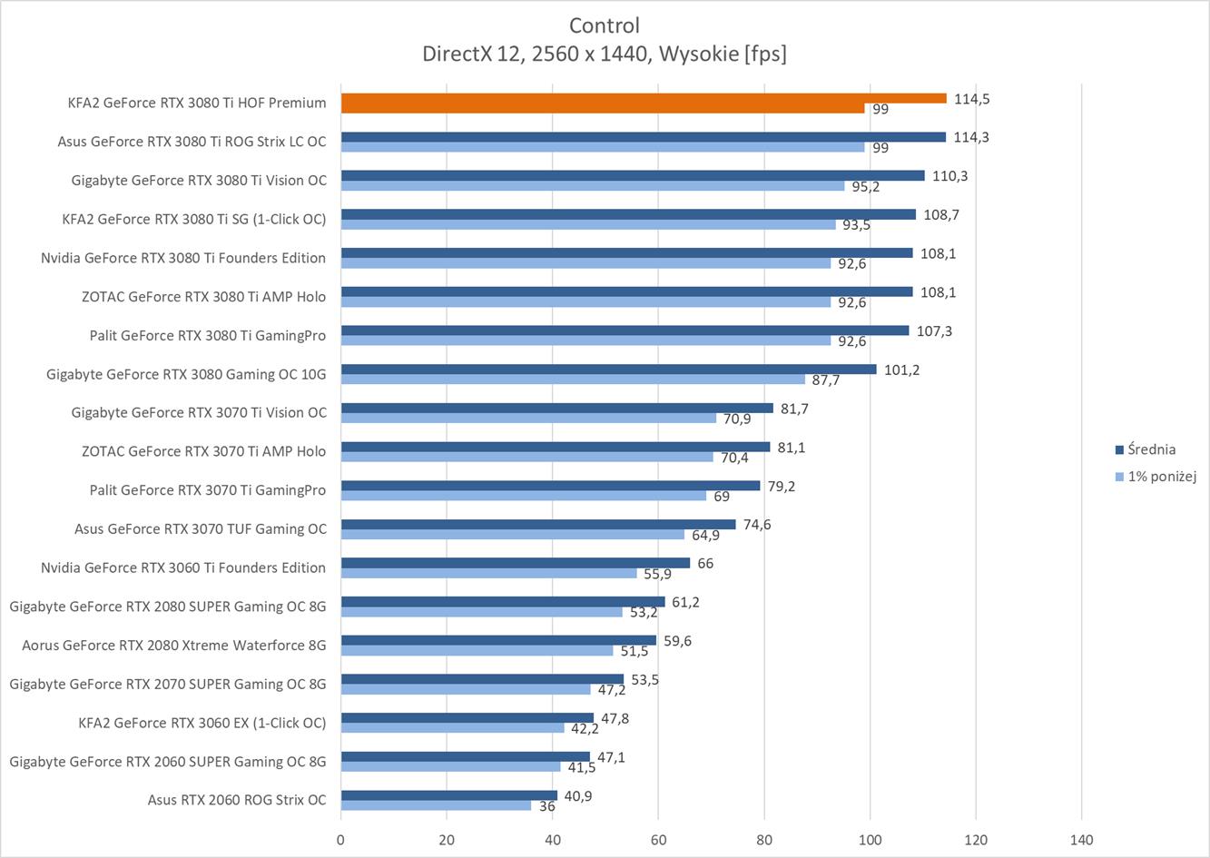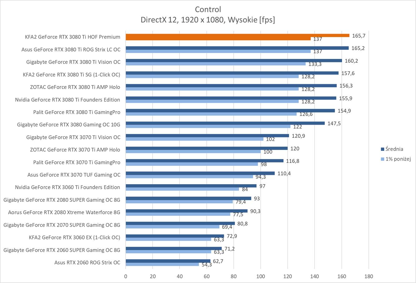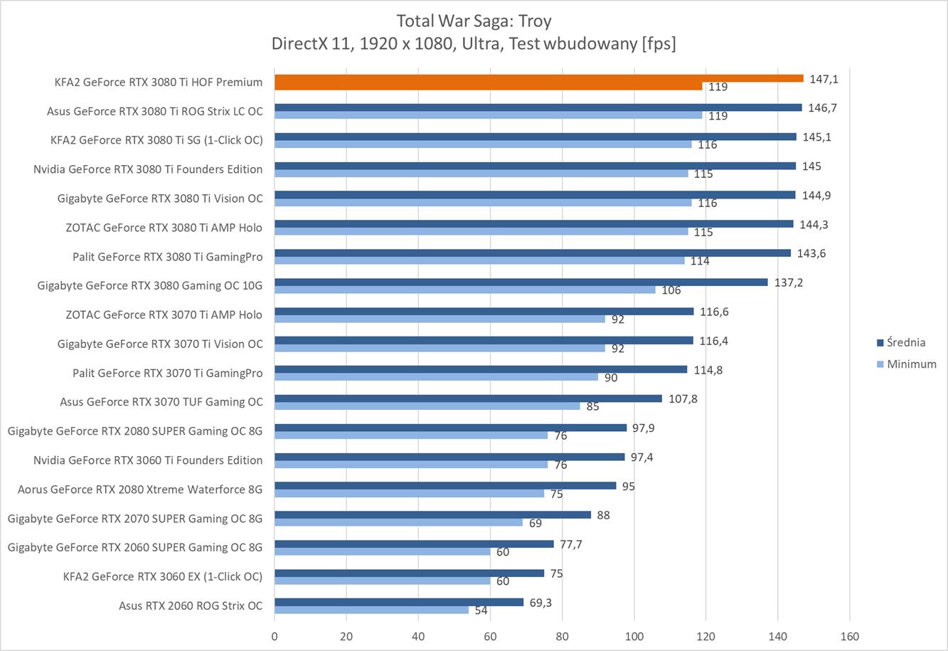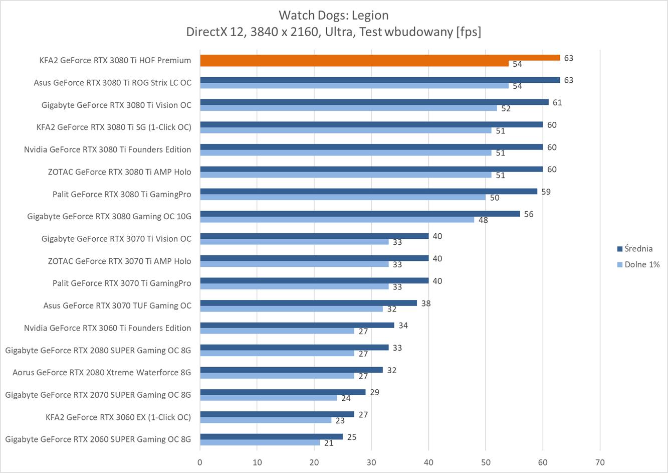 Karta jest bez wątpienia najwydajniejsza w zestawieniu. Przewaga nad modelem Asusa nie jest duża, ale jednak pozwoliła karcie KFA2 na zajęcie pierwszego miejsca na wykresach. Bez wątpienia więc karta świetnie sprawdzi się w rozdzielczości 4K i ciężko będzie o wydajniejszy model RTX 3080 Ti.