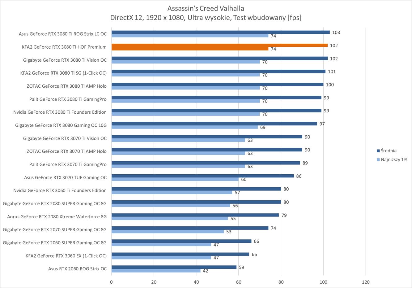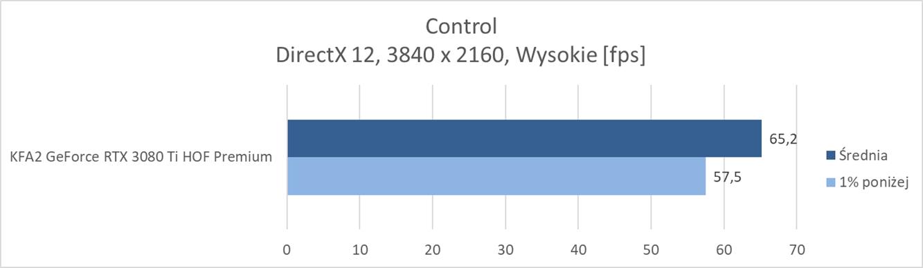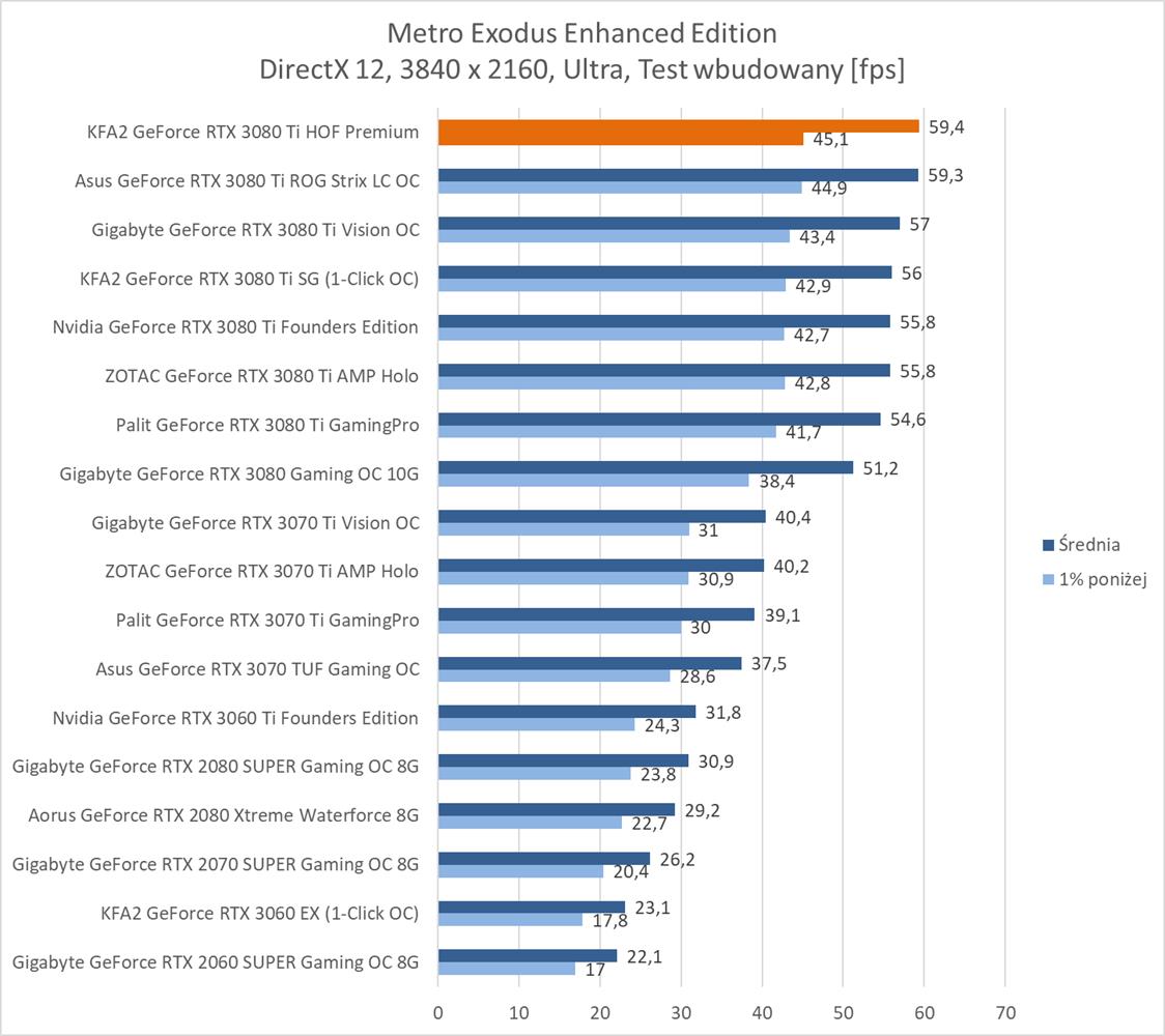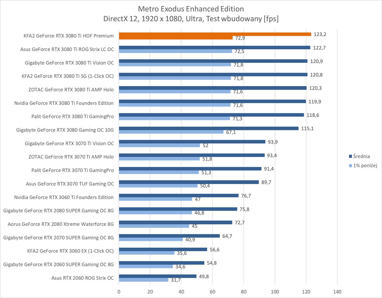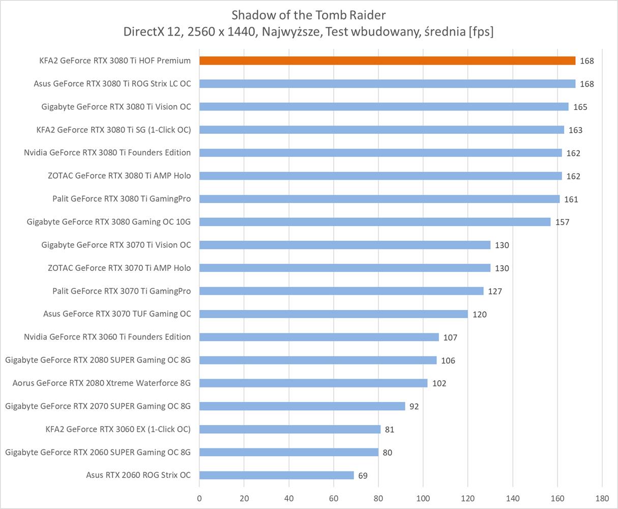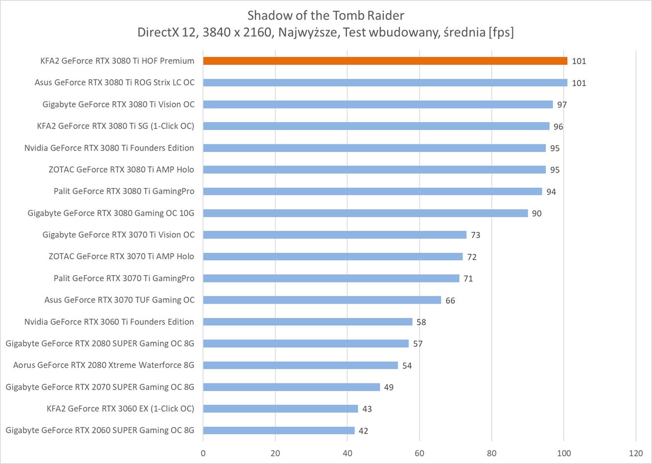 Karta jest bez wątpienia najwydajniejsza w zestawieniu. Przewaga nad modelem Asusa nie jest duża, ale jednak pozwoliła karcie KFA2 na zajęcie pierwszego miejsca na wykresach. Bez wątpienia więc karta świetnie sprawdzi się w rozdzielczości 4K i ciężko będzie o wydajniejszy model RTX 3080 Ti.