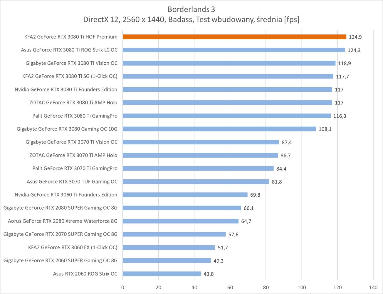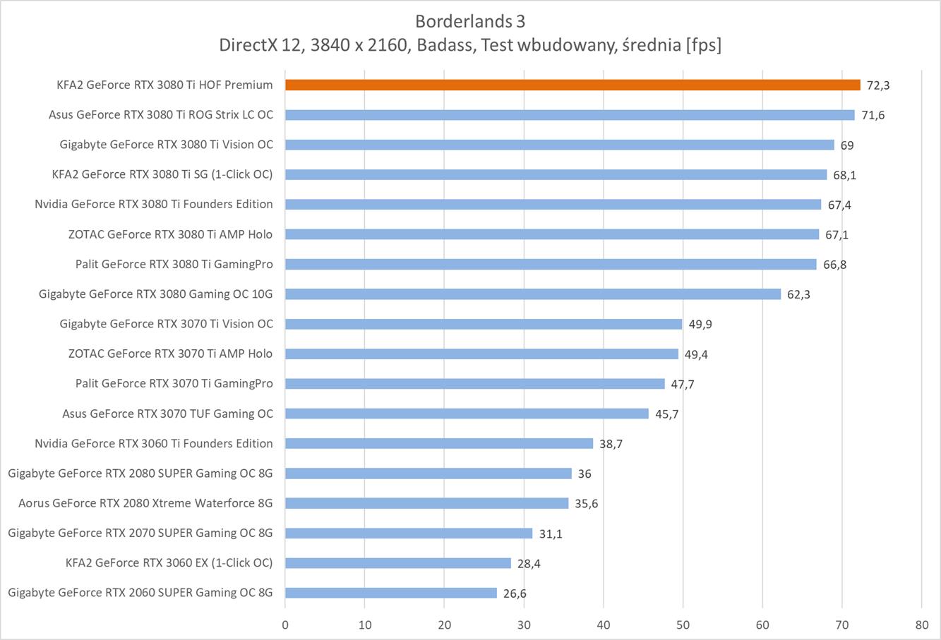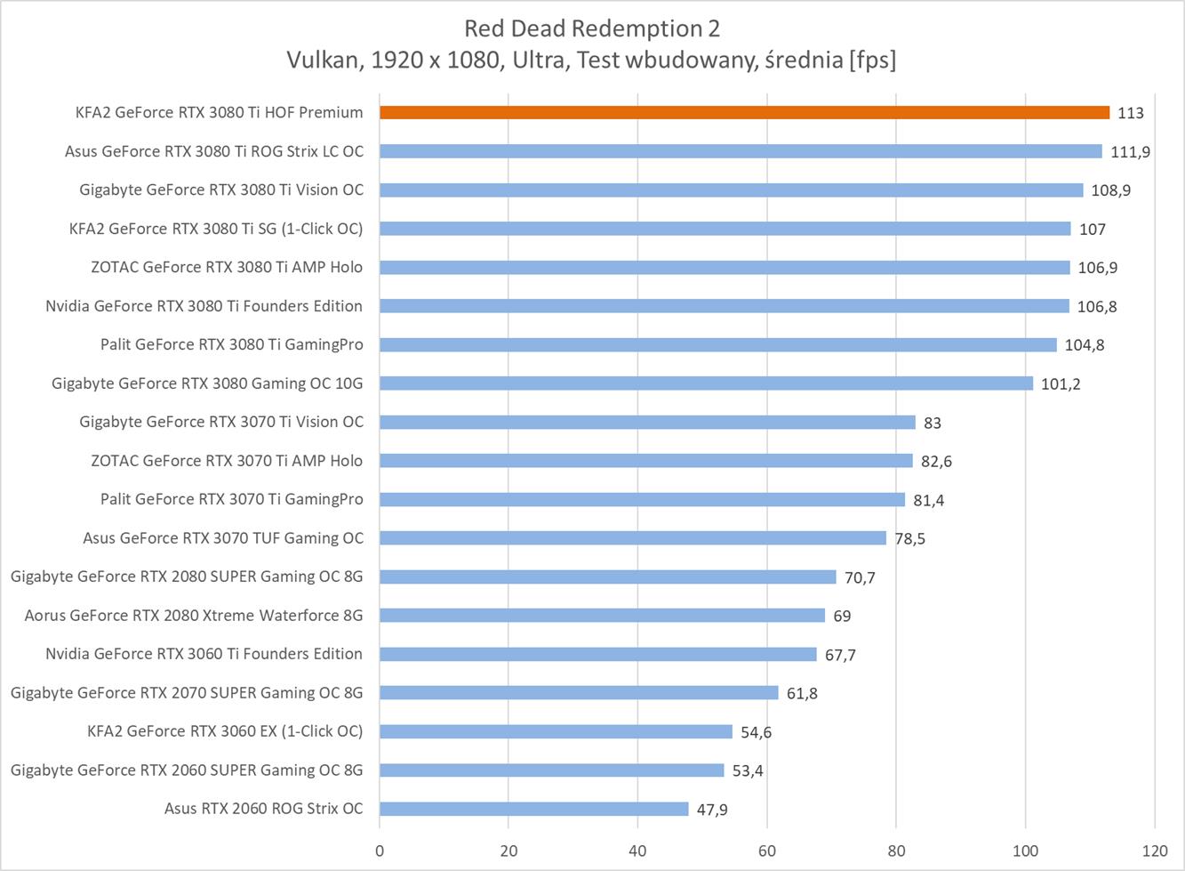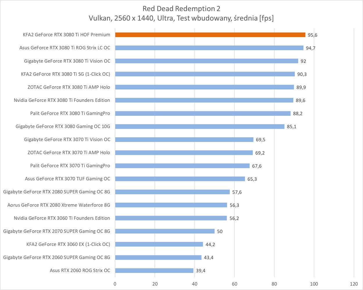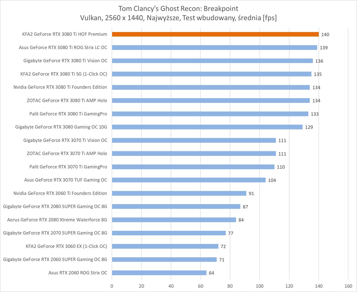 Karta jest bez wątpienia najwydajniejsza w zestawieniu. Przewaga nad modelem Asusa nie jest duża, ale jednak pozwoliła karcie KFA2 na zajęcie pierwszego miejsca na wykresach. Bez wątpienia więc karta świetnie sprawdzi się w rozdzielczości 4K i ciężko będzie o wydajniejszy model RTX 3080 Ti.