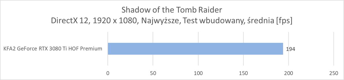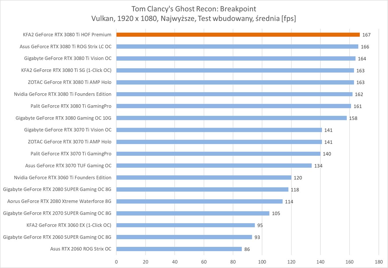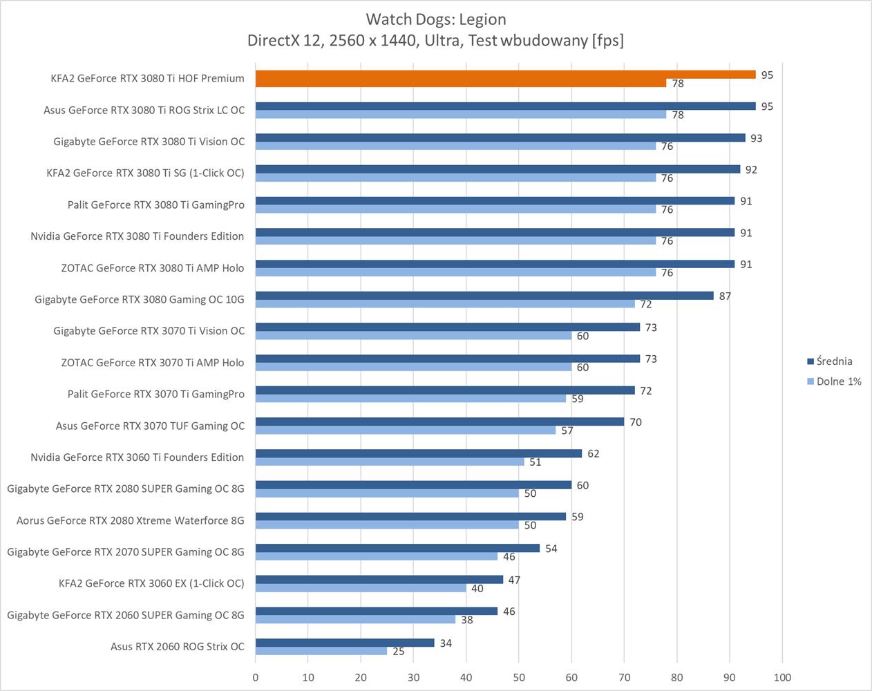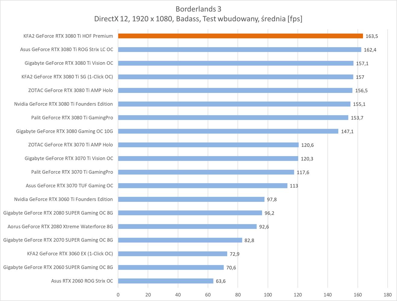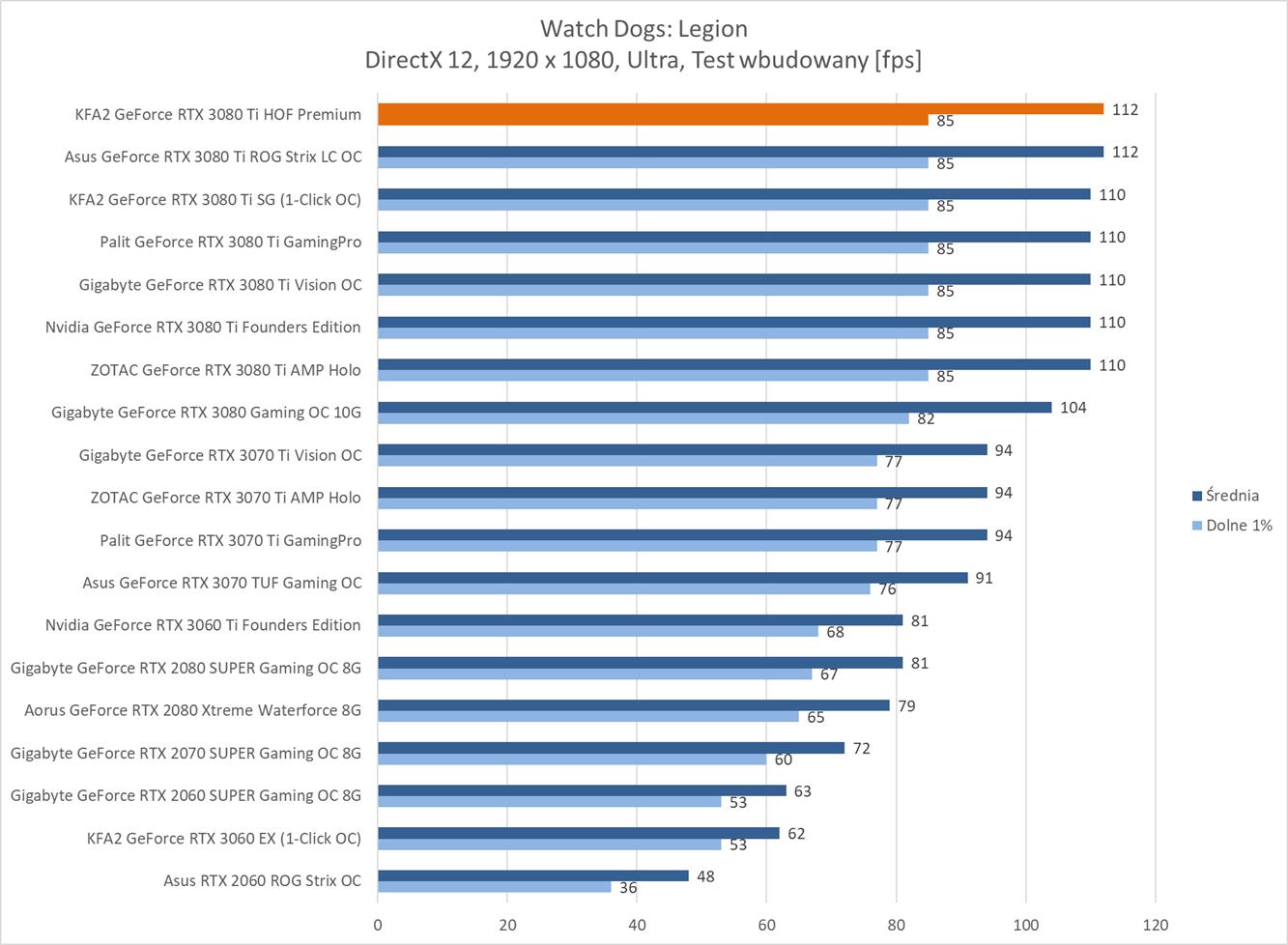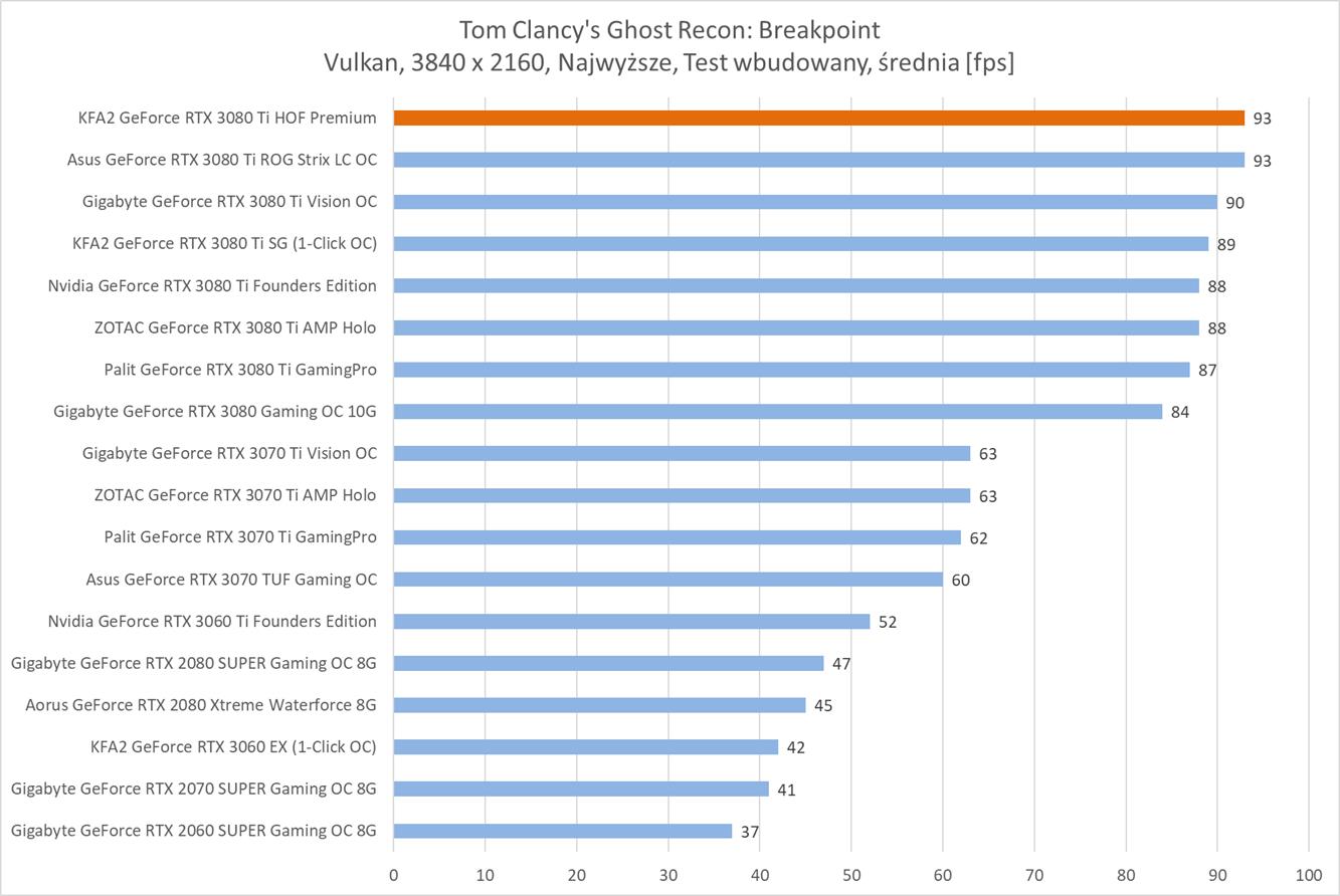Karta jest bez wątpienia najwydajniejsza w zestawieniu. Przewaga nad modelem Asusa nie jest duża, ale jednak pozwoliła karcie KFA2 na zajęcie pierwszego miejsca na wykresach. Bez wątpienia więc karta świetnie sprawdzi się w rozdzielczości 4K i ciężko będzie o wydajniejszy model RTX 3080 Ti.