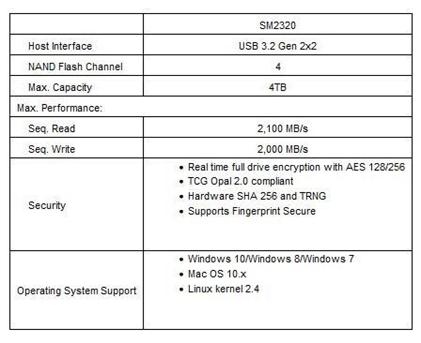 SM2320 został zaprojektowany tak, aby w jednym układzie łączyć sferę hardware, oprogramowanie układowe, a także funkcje zabezpieczeń wysokiego poziomu. Po stronie wydajności kontroler wspiera wszystkie USB aż do interfejsu USB 3.2 Gen 2, dzięki czemu zapewnia sekwencyjne prędkości odczytu/zapisu do 2100/2000 MB/s. Wszystko dzięki m.in. wspieraniu czterech kanałów NAND, kompleksowej ochronie ścieżki danych NANDXtend ECC czy kościom TLC i QLC NAND o pojemności do 4 TB. Firma zadbała też o 256-bitowe szyfrowanie AES, pełną zgodność ze specyfikacją Opal Trusted Computing Group (TCG) oraz dodatkową obsługę funkcji Fingerprint Security.