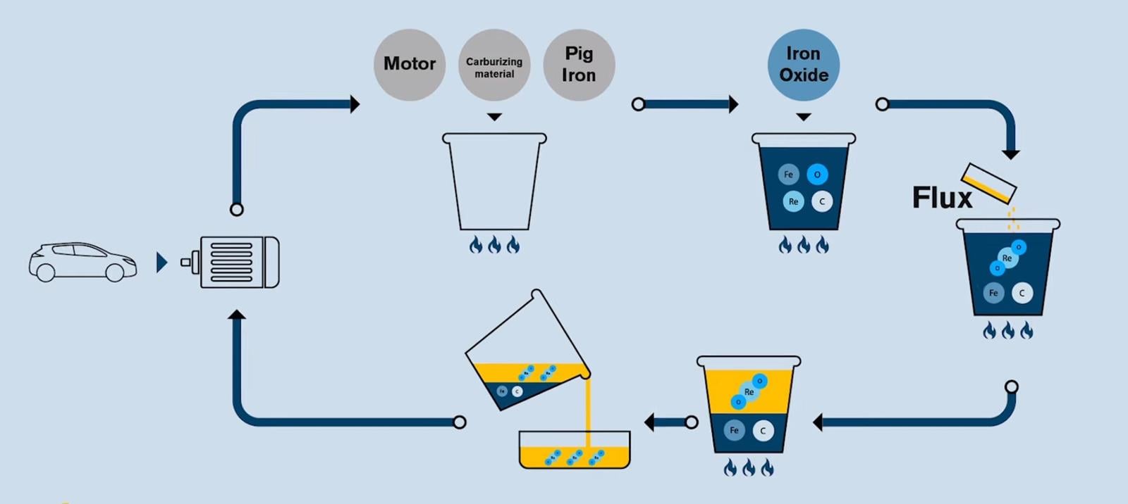 Ten nowy recykling elektrycznych silników w wykonaniu Nissana zajmuje o połowę mniej czasu i jest skuteczny aż w 98%. Sprowadza się do wystawienia silnika elektrycznego na działanie temperatury rzędu 1400 stopni Celsjusza po dodaniu do niego mieszanki stali hutniczej i stali do nawęglania. Do uzyskanego w tym procesie (ciekawe, jak wiele zanieczyszczeń generują wykorzystywane w tym celu piece) stopu dodaje się tlenek żelaza, który utlenia metale ziem rzadkich oraz topnik na bazie boranu, który pozwala oddzielić je od stopu żelaza i węgla.