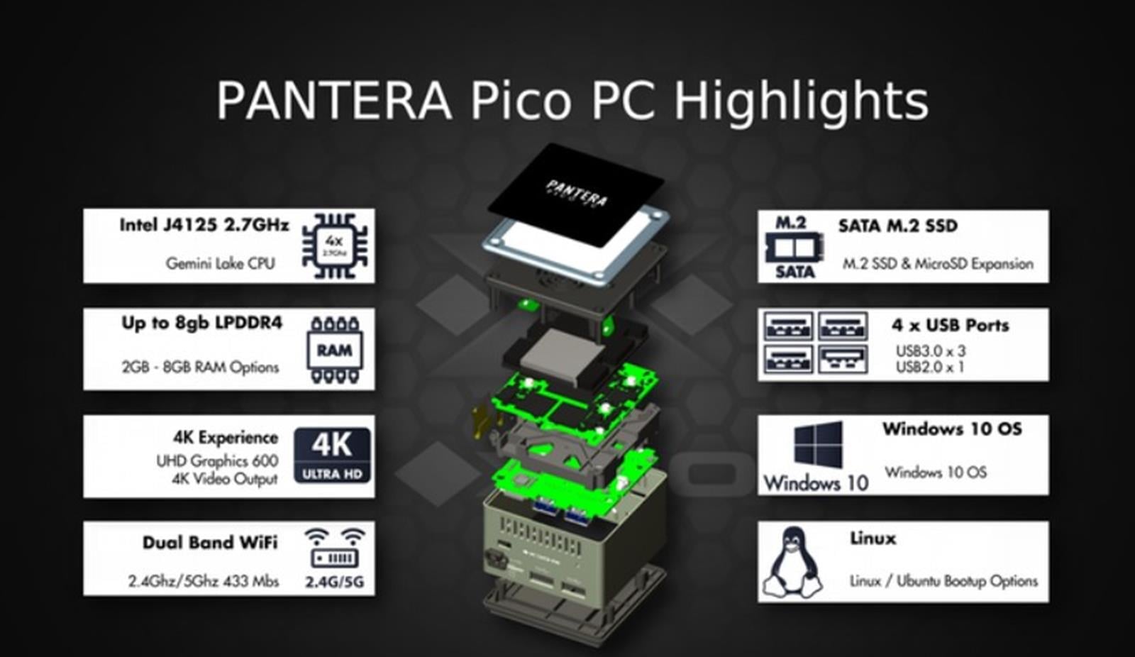 Tak więc, zamknięty w kostce o wymiarach 6,9 x 6,9 x 5,3 cm kieszonkowy komputer osobisty Pantera Pico PC jest najwyraźniej najmniejszym PCtem z procesorem Intel Gemini Lake. Obecność tego CPU jest o tyle korzystna, że został on specjalnie zaprojektowany w oparciu o mikroarchitekturę Goldmont Plus, gwarantującą niski pobór mocy, co wspomaga może i nieco przestarzały, ale ciągle niski, bo 14 nm proces produkcyjny.