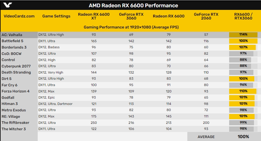 Dlatego też w ujawnionych szczegółach wydajności, AMD porównało swojego Radeona RX 6600 z GeForce RTX 3060. W tej walce karty szły praktycznie łeb w łeb, będąc raz wydajniejszymi w jednej, a raz w drugiej grze, ale zamykają się w widełkach od -12 do 14% różnicy wydajności.
