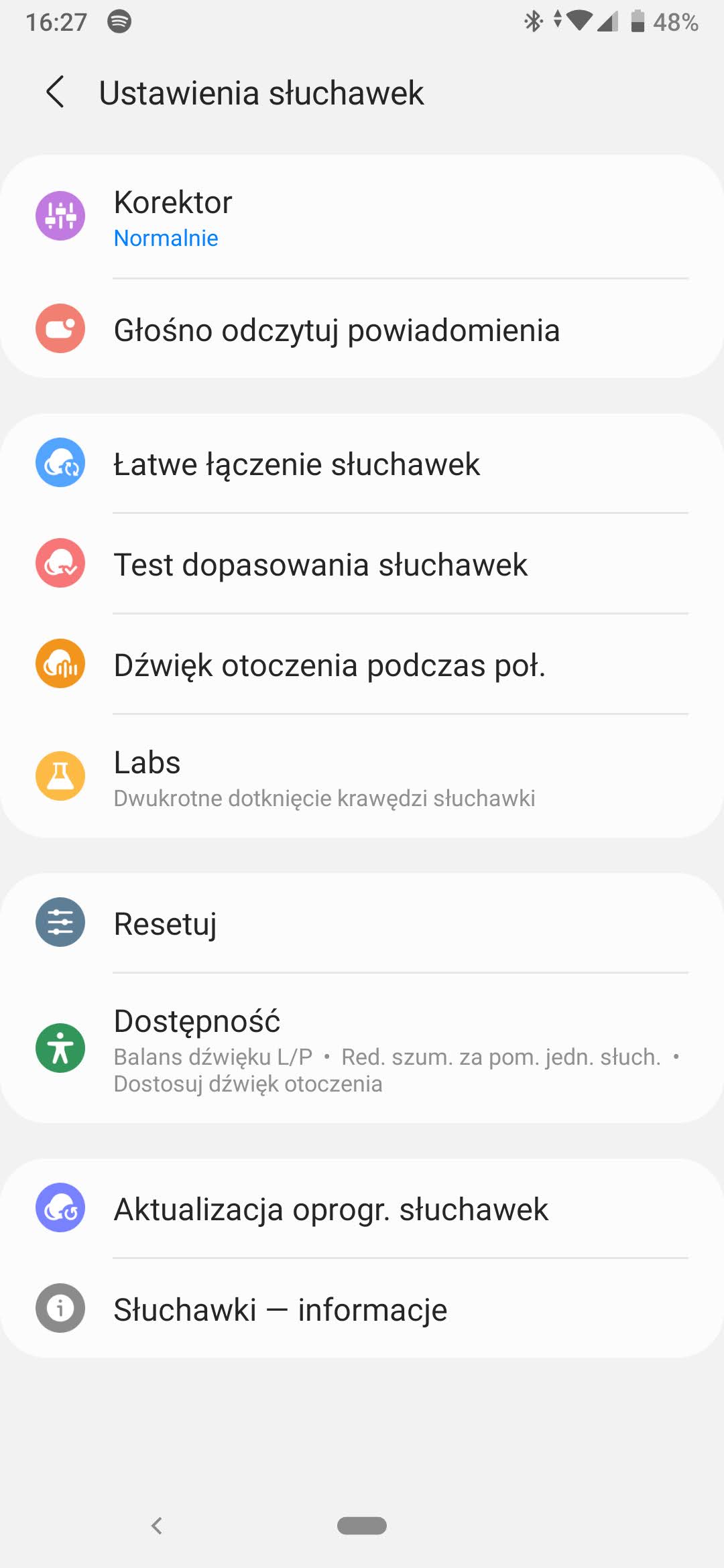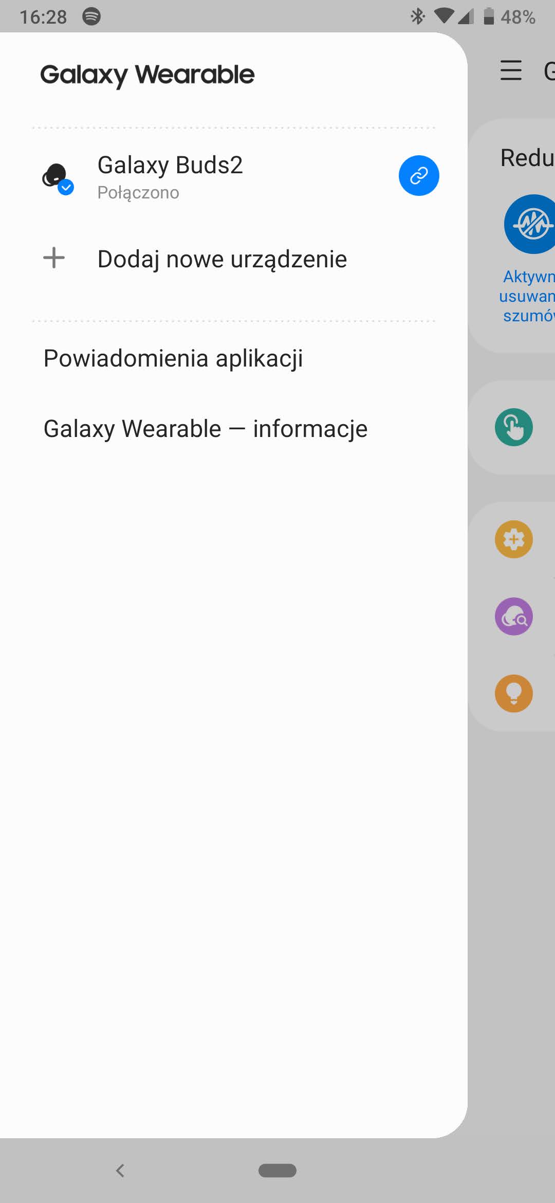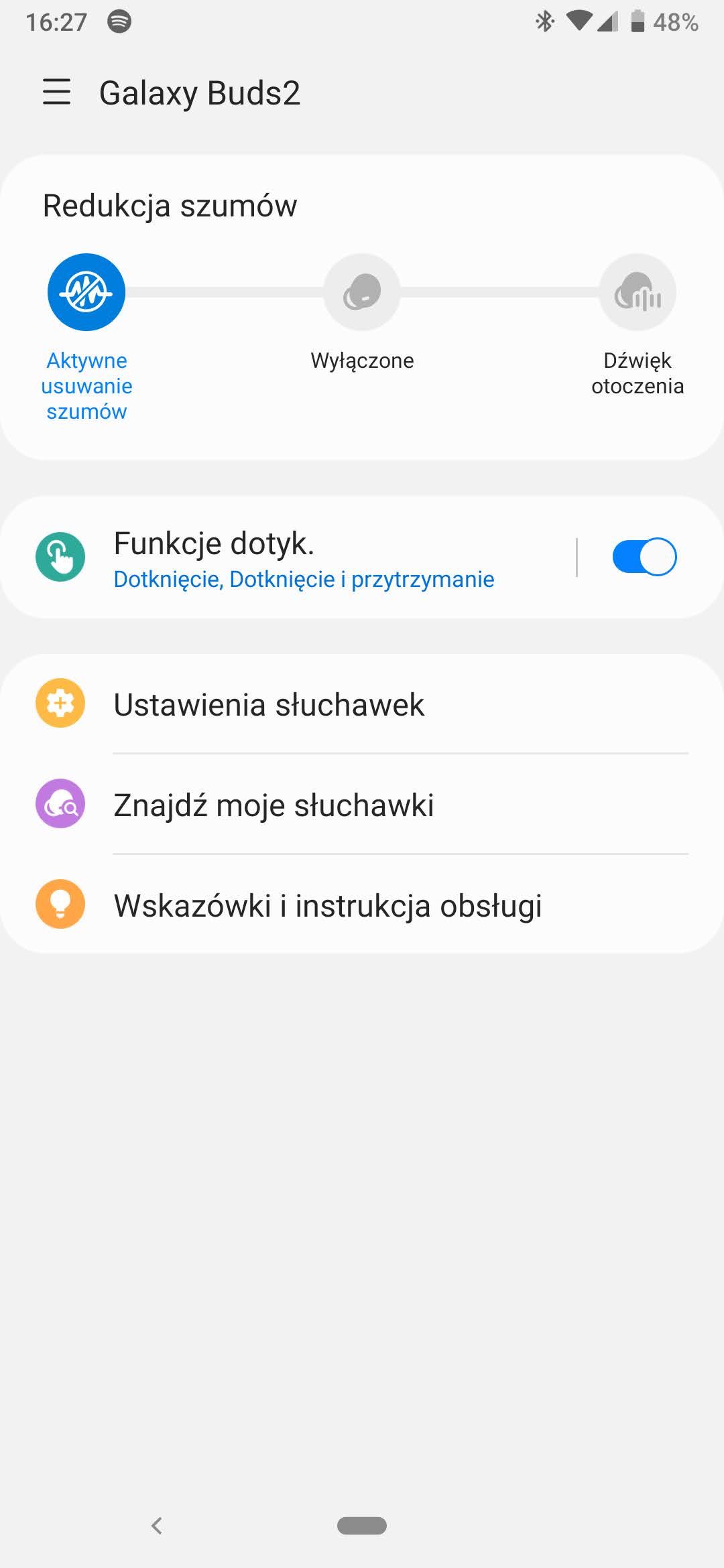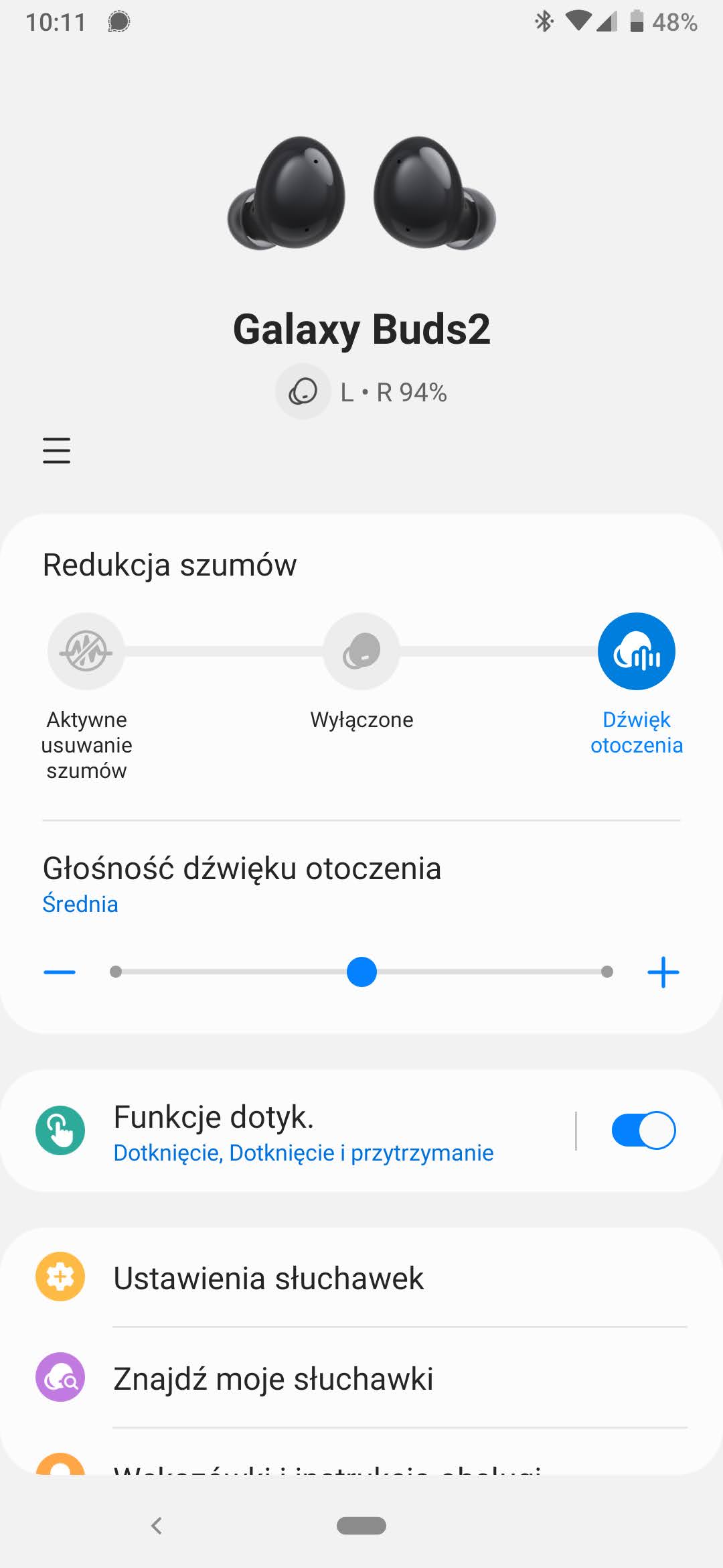 Samsung zapewnił Galaxy Buds2 wsparcie aplikacji Galaxy Wearable, która posiada wszystko to, co wydaje się najważniejsze. Pierwsze menu posiada informacje o poziomie naładowania słuchawek, tryby redukcji szumów (jednopoziomowe ANC, brak, dźwięk otoczenia z trzema poziomami), opcje przypisanych na stałe funkcji dotykowych, które możemy tylko dezaktywować/aktywować, funkcje “znajdź moje słuchawki” i rozległą zakładkę ustawień.