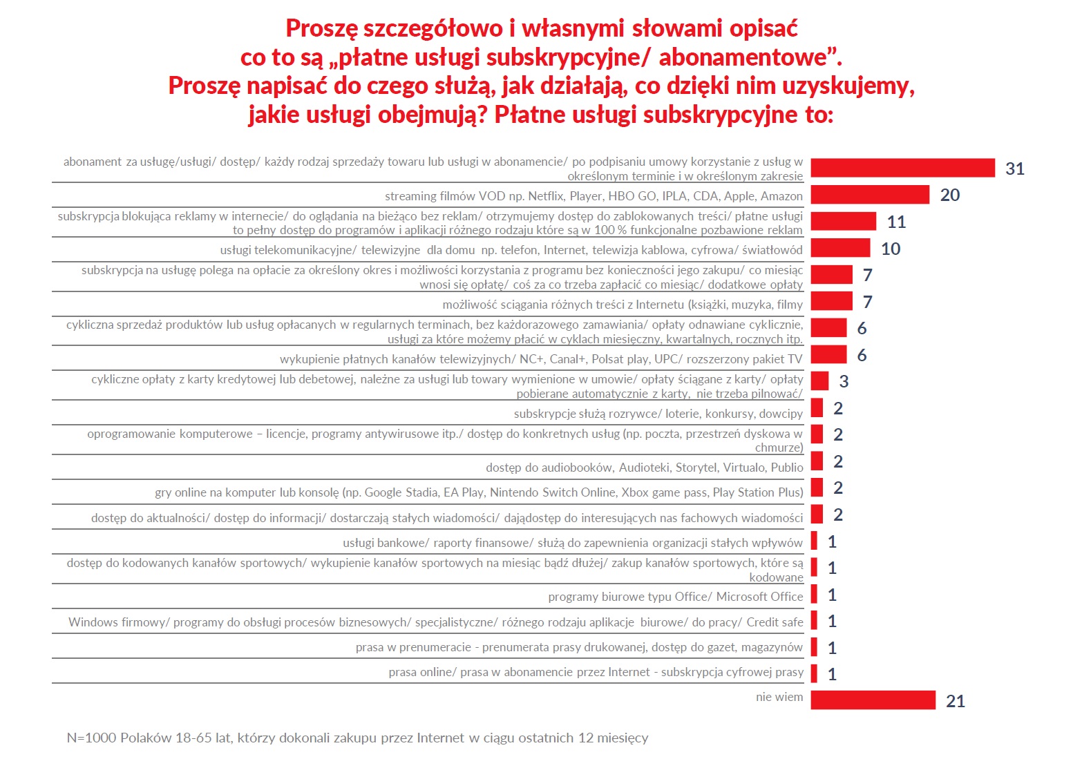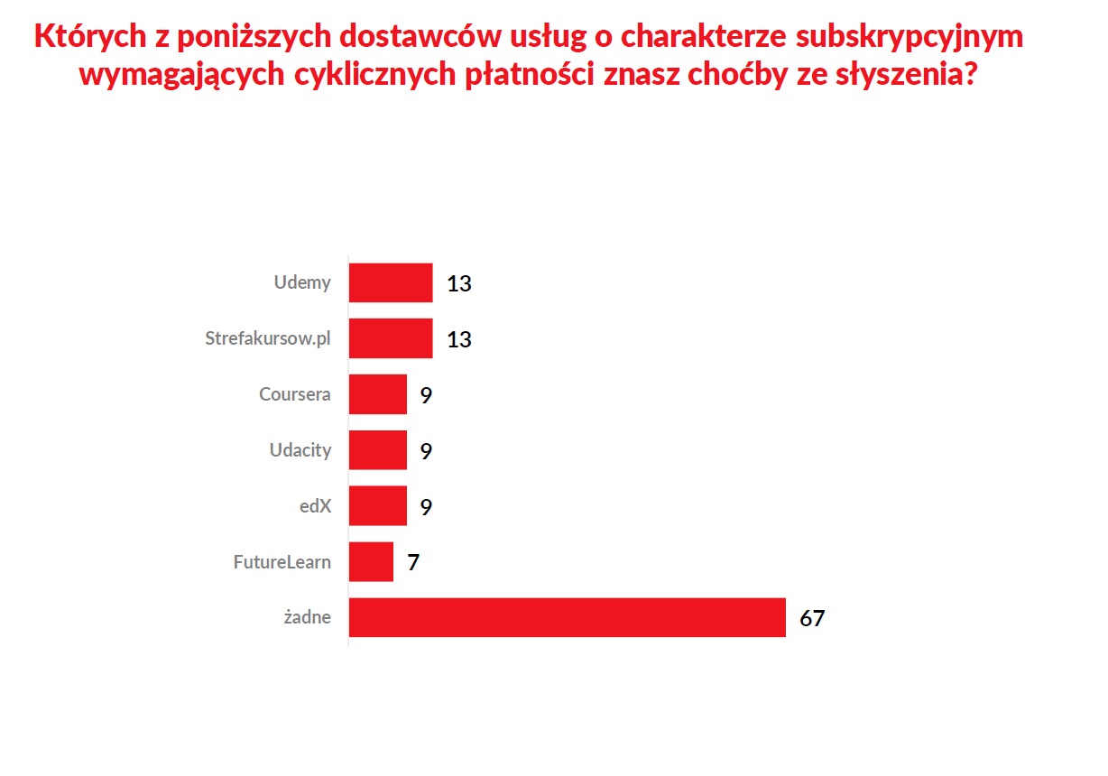 Z raportu wynika, że tylko 21% badanych nie jest w stanie własnymi słowami opisać, czym jest usługa subskrypcyjna i jak działa. Co piąta osoba spontanicznie wskazuje, że w takim modelu można mieć dostęp do filmów i seriali. Ale dla największej liczby osób (31%) jest to po prostu abonament za usługę.