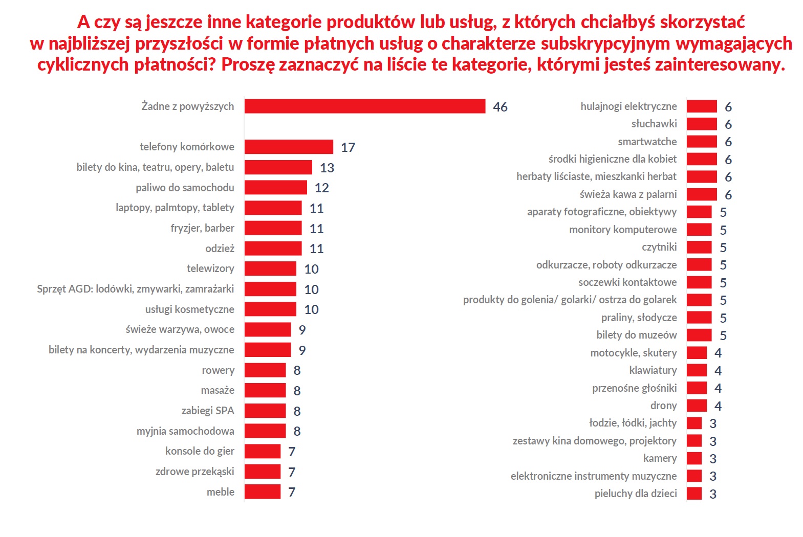 Czy chcielibyśmy korzystać z innych, nowych usług subskrypcyjnych? Wygląda na to, że… niekoniecznie. Spośród przeróżnych propozycji najwięcej, ale tylko 17% badanych chciałoby w takim modelu korzystać z telefonu komórkowego, 13% z biletów do kina, teatru lub opery, a 12% z paliwa do samochodu. Kto by nie chciał… Choć częściowo działa to w przypadku aut elektrycznych (np. GreenWay).