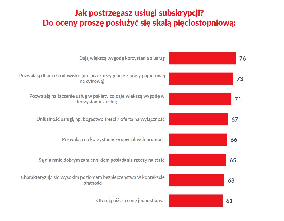 A dlaczego korzystamy z subskrypcji? Bo są wygodne. Tak wskazuje 76% badanych, choć bardzo podobne odpowiedzi udziela 71% badanych. Ważne są dla nas też treści na wyłączność – 67%, ale też zaskakująco dużo osób – 73% mówi o korzystnym wpływie na środowisko, jak np. rezygnacja z gazet papierowych na rzecz cyfrowych.