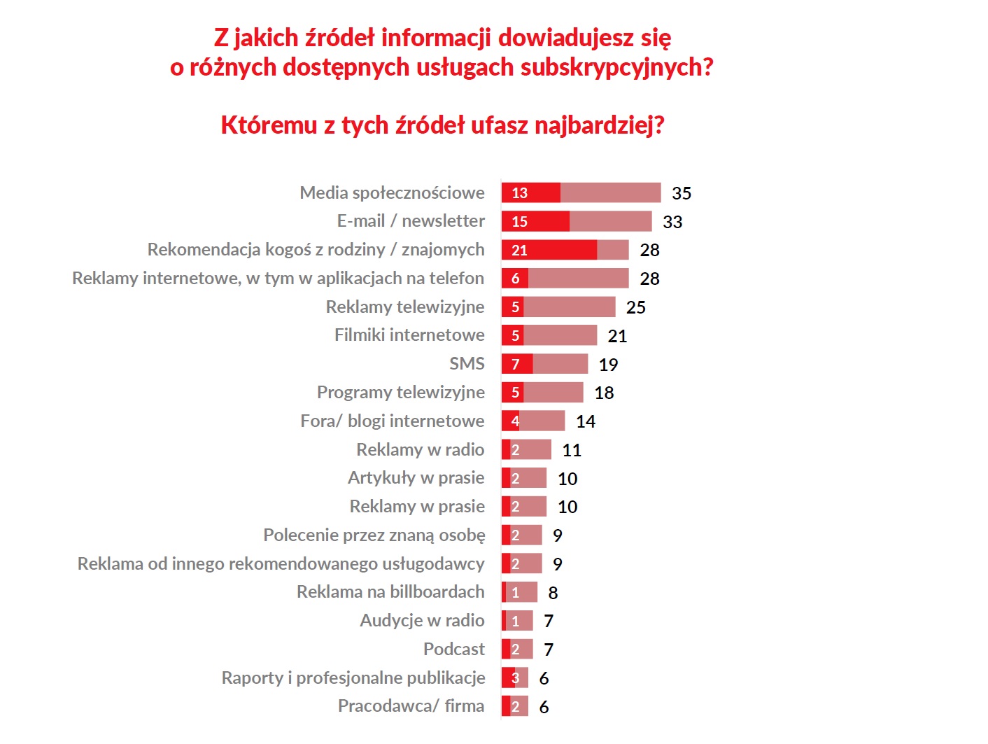 Skąd czerpiemy informacje o subskrypcjach? Głównie z Internetu. 35% osób wskazuje media społecznościowe, 33% e-maile i newslettery, a 28% reklamy w sieci. Ale największe zaufanie, jak zawsze mamy do opinii znajomych i rodziny. Jako źródło wiedzy wskazało to 28% osób, przy czym ma ono największe zaufanie – 21%. W przypadku innych źródeł informacji nie mamy aż takiego zaufania.