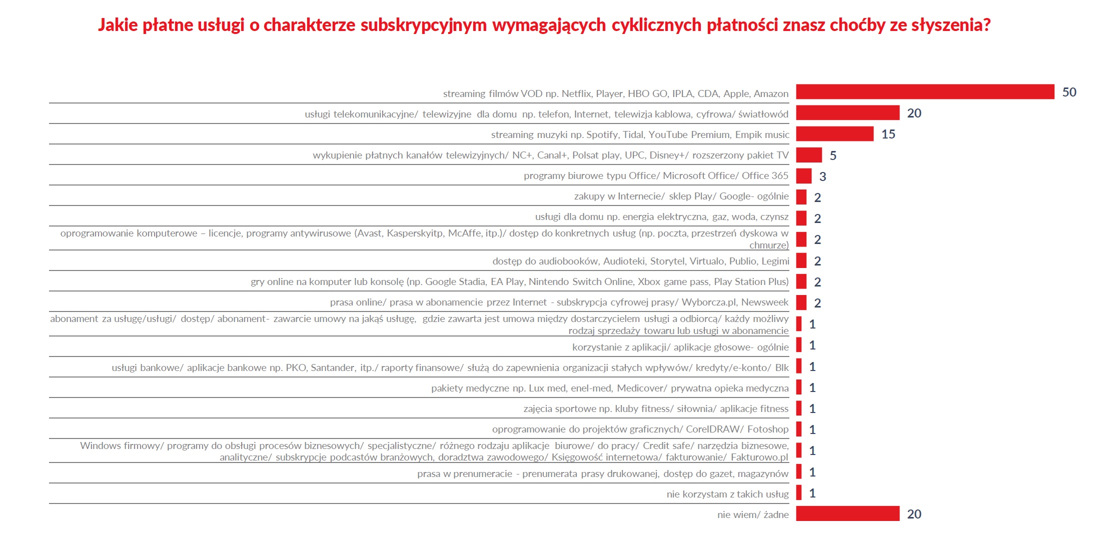 Odpowiedź – filmy i seriale, pada też przy pytaniu, jakie znasz płatne usługi? Połowa badanych wskazuje serwisy VOD, takie jak Netflix czy Amazon, a sporo za nimi są dopiero usługi telekomunikacyjne.