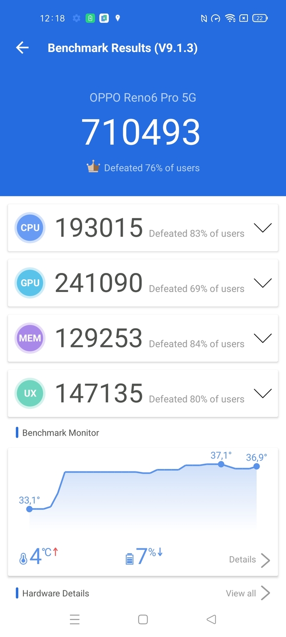 W codziennym użytkowaniu Oppo Reno6 Pro 5G działa bardzo płynnie i stabilnie. Nie przegrzewał się zbytnio, a to dzięki zastosowaniu dużej komory chłodzącej którą chwali się producent. Od razu jednak zastrzegam, że nie oznacza to, że smartfon cały czas jest zimny! Co to, to nie. Po zapętleniu benchmarka Antutu telefon zrobić się lekko ciepły, a w ostatnim teście wynik spadł o 15 tys. pkt względem pierwszego. Także efekt znany z innych smartfonów występuje. Po prostu został zredukowany.