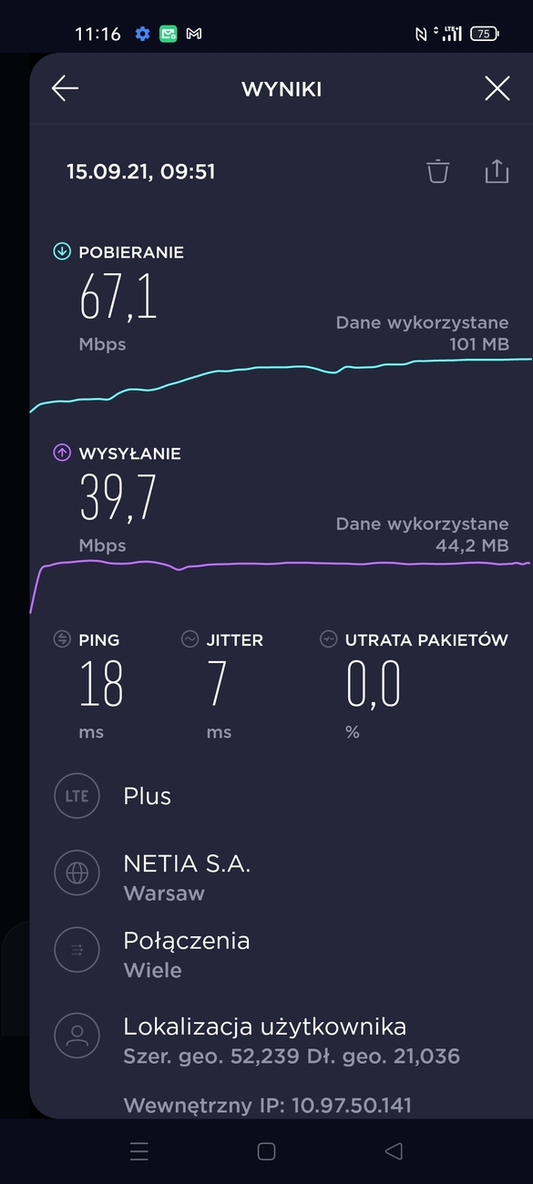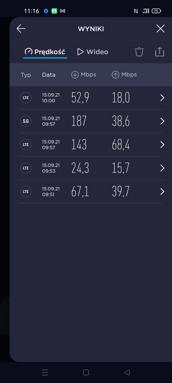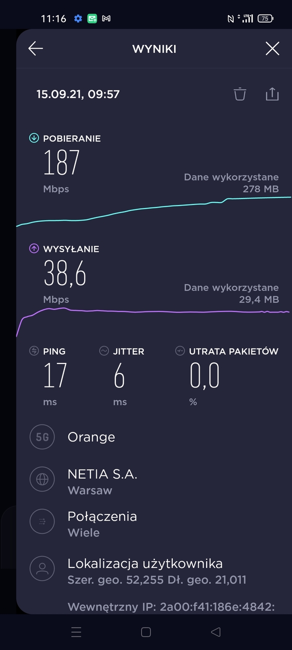 Jak sama nazwa wskazuje smartfon obsługuje sieci 5G, ALE ja miałem problemy z łącznością 5G w sieci Plus, czyli w paśmie 2600 MHz. Konkretnie w centrum Warszawy 5G w Orange śmigało aż miło (187 Mb/s – download, 38,6 Mb/s – upload), a po włożeniu karty Plusa dostępne było tylko LTE+… Być może to tylko kwestia oprogramowania, albo mojego konkretnego egzemplarza. Poza tym możemy korzystać oczywiście z szybkiego Wi-Fi 6.
