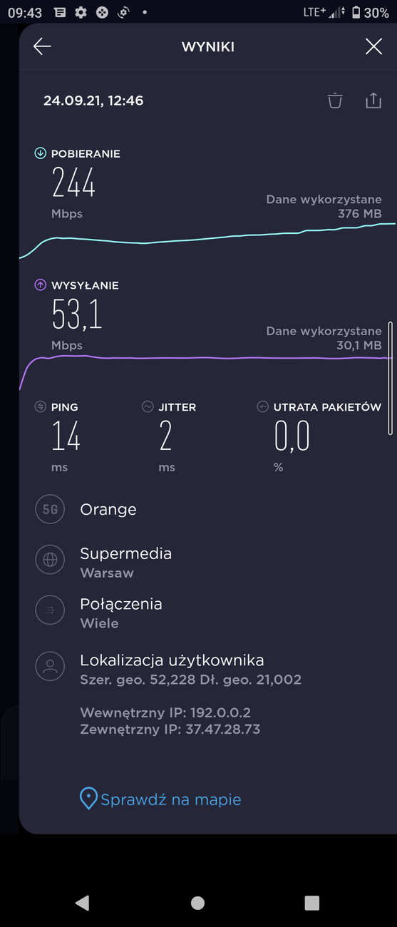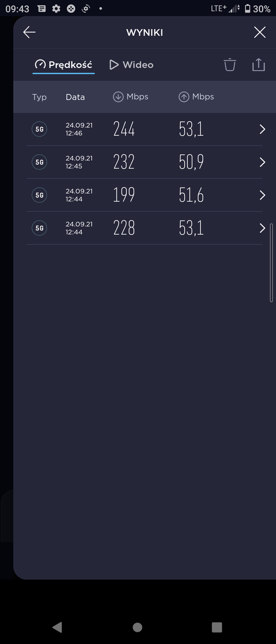 Smartfon obsługuje sieci 5G i to u wszystkich operatorów. Również w paśmie 2600 MHz z którego korzysta sieć Plus. I to bardzo szybko i sprawnie. Udało mi się osiągnąć 244 Mb/s w przypadku ściągania danych w Warszawie. Naturalnie, nie będąc w zasięgu 5G, możemy skorzystać z LTE lub Wi-Fi 6. Telefon jest Dual-Simem, ale hybrydowym. Jeśli więc będziemy chcieli skorzystać z dwóch kart nano SIM, musimy wyjąć kartę pamięci, a przy tej pojemności pamięci wewnętrznej może być to w pewnym momencie kłopotliwe. A e-SIM tu nie uświadczymy! Na szczęście jakość połączeń głosowych przez cały okres trwania testów była bardzo dobra. Telefon został wyposażony jeszcze w Bluetooth 5.2, port USB C 3.1, NFC oraz diodę powiadomień.