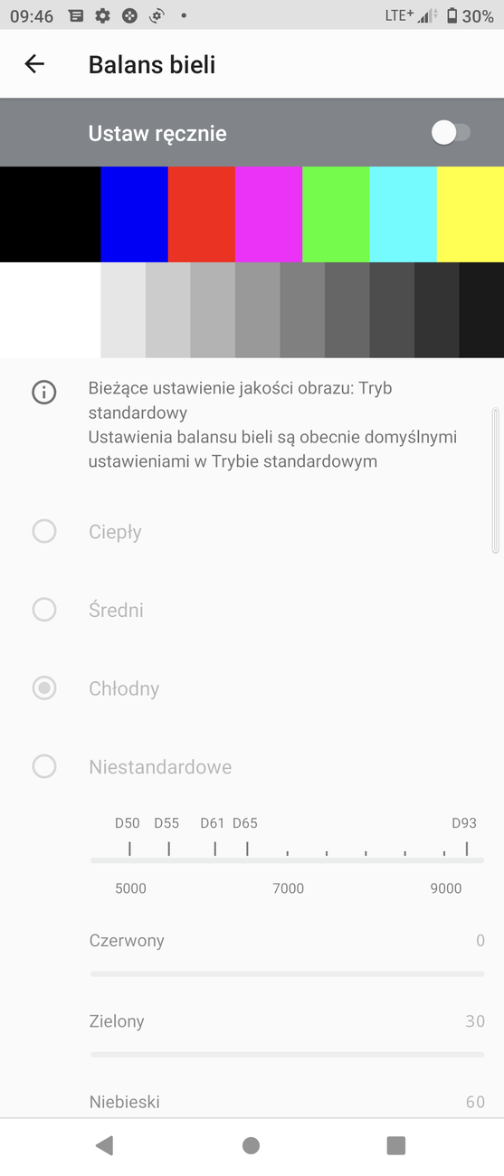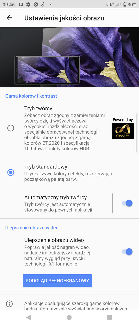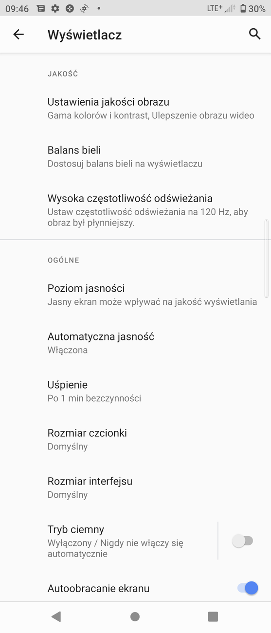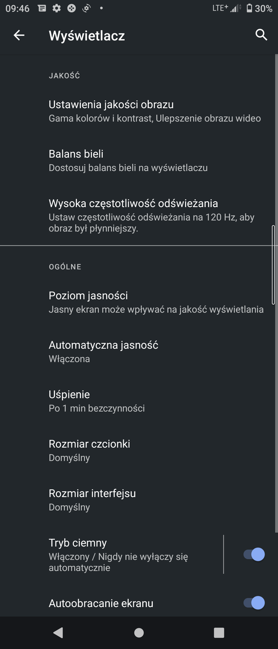Wyświetlacz to 6,1 calowa matryca OLED HDR o kinowych proporcjach 21/9 i rozdzielczości 2520 x 1080. Nie zapomniano również o 120 Hz odświeżaniu. Ekran jest płaski, co niektórym może pasować, a niektórym nie, ale jakość wyświetlanego obrazu jest po prostu perfekcyjna. Kąty widzenia, jasność maksymalna, kolory itd. – wszystko stoi na bardzo wysokim poziomie. Do oglądania filmów sprawdzi się wręcz perfekcyjnie. Podobnie jak w poprzedniku (Xperii 5 II) chroni go szkło Gorilla Glass 6. W ustawieniach możemy m.in. regulować nasycenie i temperaturę barw, włączać lub wyłączać 120 Hz odświeżanie oraz tryb ciemny dla menu.