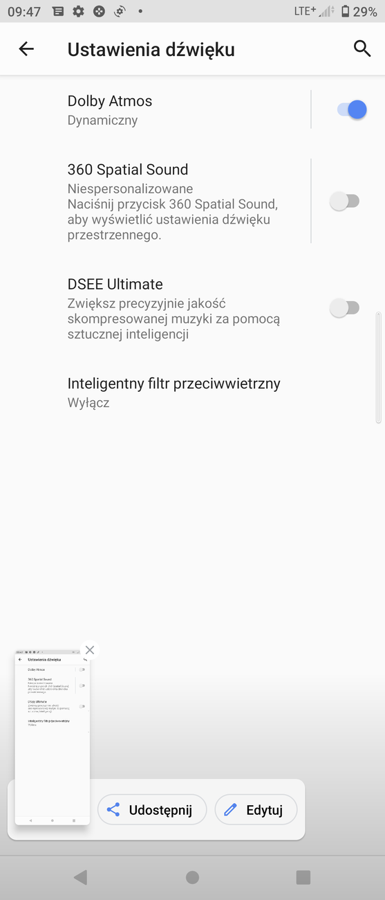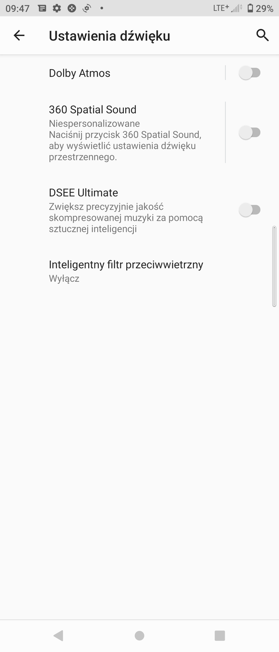 Dźwięk na złączu miniJack również wypada bardzo dobrze, tym bardziej, że mamy szerokie pole do jego personalizacji. W ustawieniach poza manualnym korektorem częstotliwości znajdziemy jeszcze m.in. system Dolby Atmos.