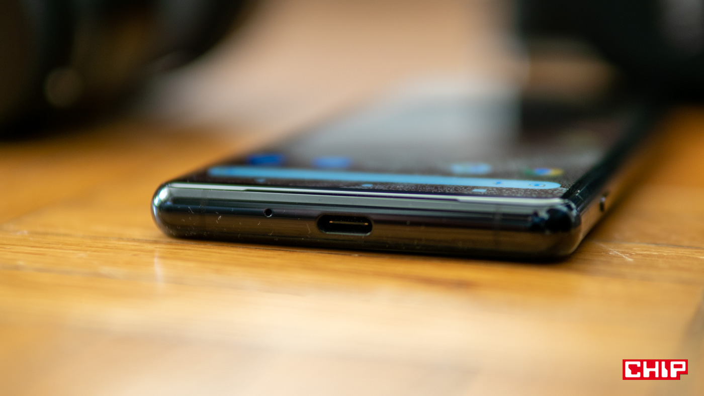 Port USB C został umieszczony u dołu ramki, natomiast złącze miniJack – po przeciwległej stronie. Przyciski on/off, regulacji głośności i spustu migawki aparatu umiejscowiono po prawej stronie, natomiast tackę na karty znajdziemy po lewo.