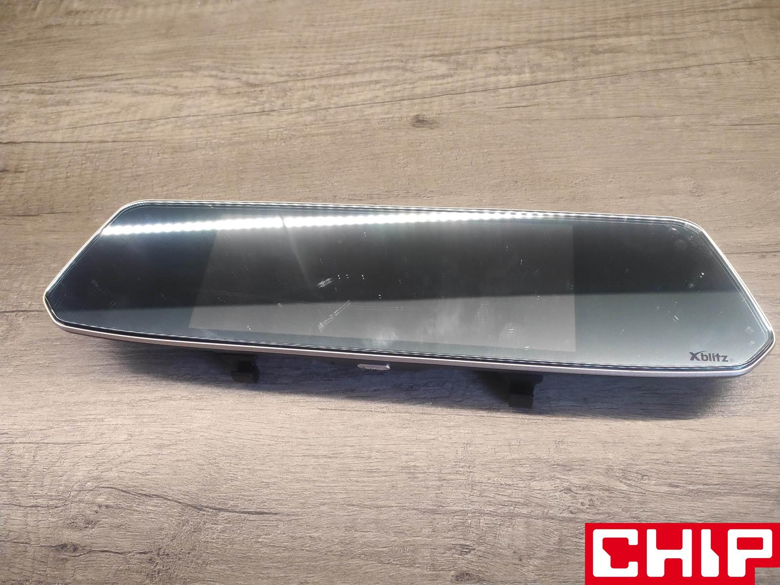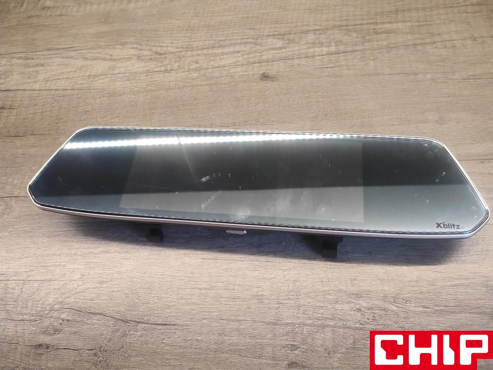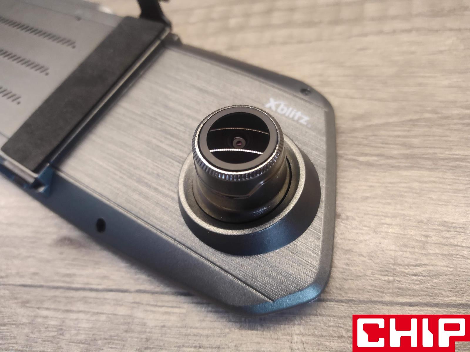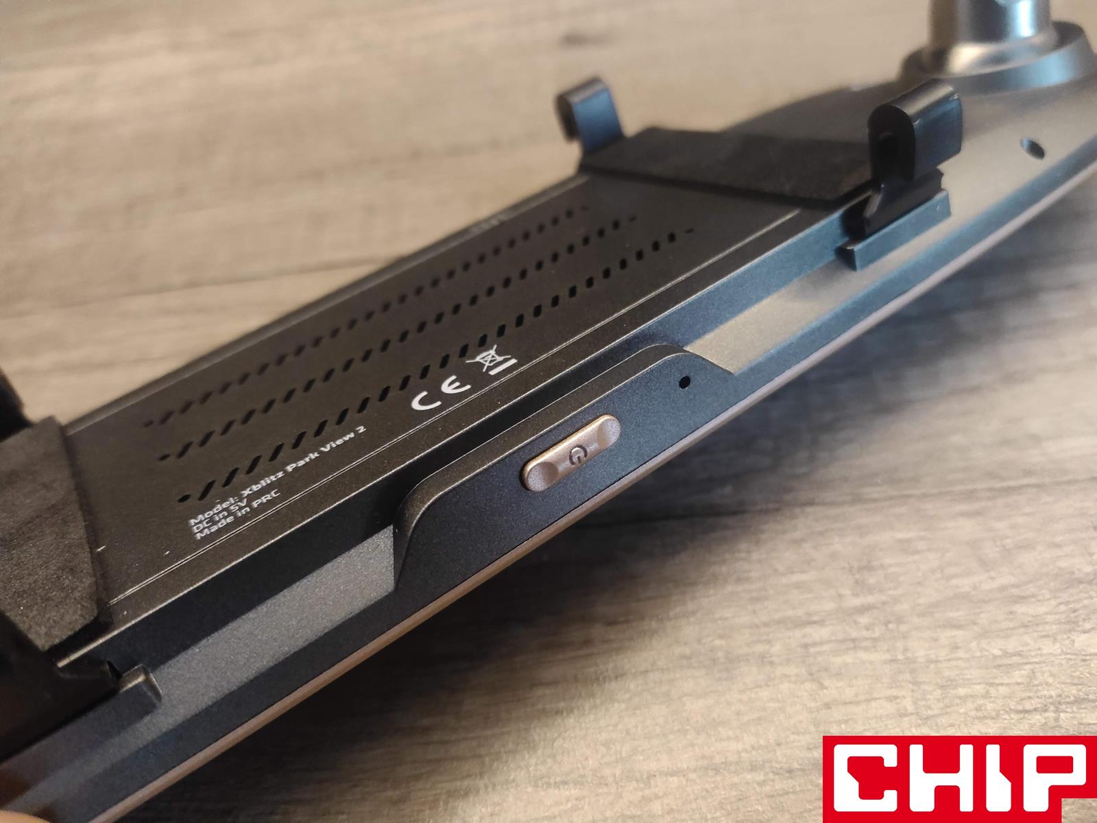 Xblitz postarał się o to, aby ten wideorejestrator przypominał możliwie najbardziej lusterko wewnętrzne na dwa sposoby. Pierwszym tego przejawem jest to, że na dolnej krawędzi znajdziemy tylko pojedynczy przycisk on/off, aktywujący i dezaktywujący również wygaszacz ekranu. Na górnej z kolei znalazł się slot na kartę microSD do 32 GB klasy 10, port zasilania miniUSB, port na kamerę cofania i tajemnicza “dziurka” z podpisem GPS. Ta jednak jest na 99% niewykorzystywana i jest przejawem oszczędności producenta, bo korzystania z obudów zarezerwowanych dla droższych modeli.