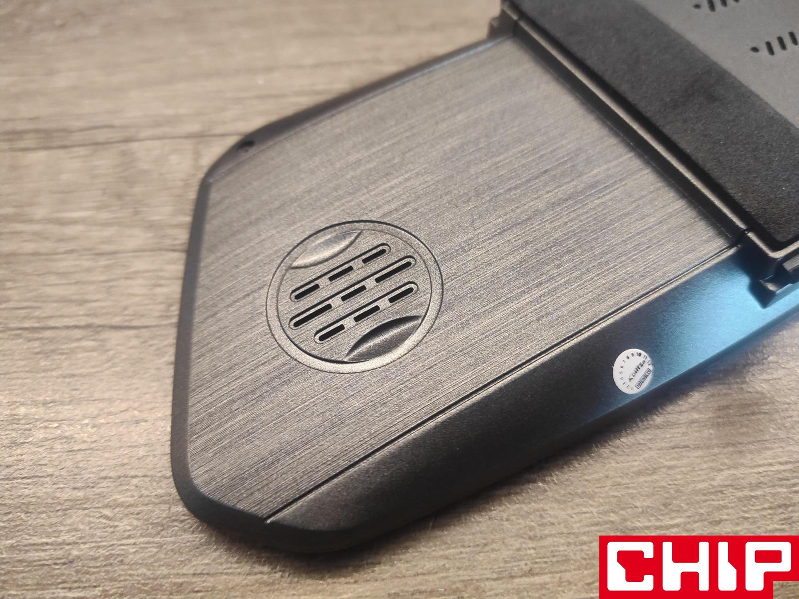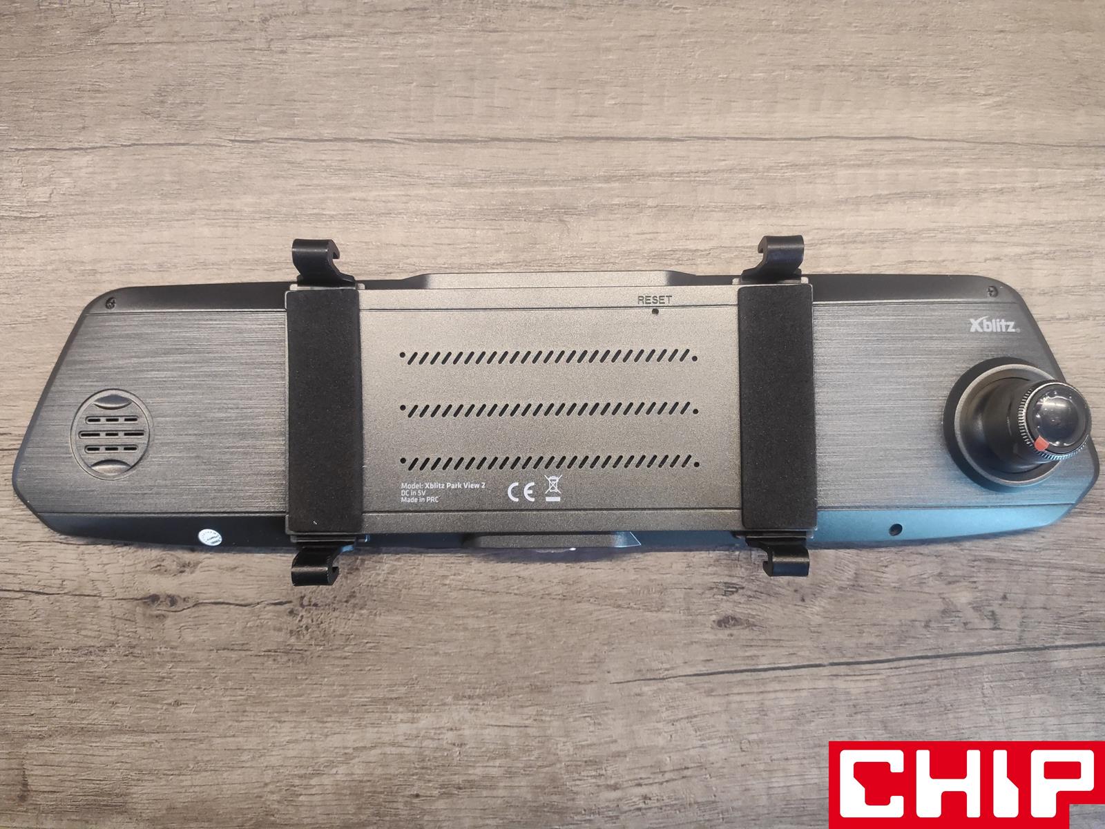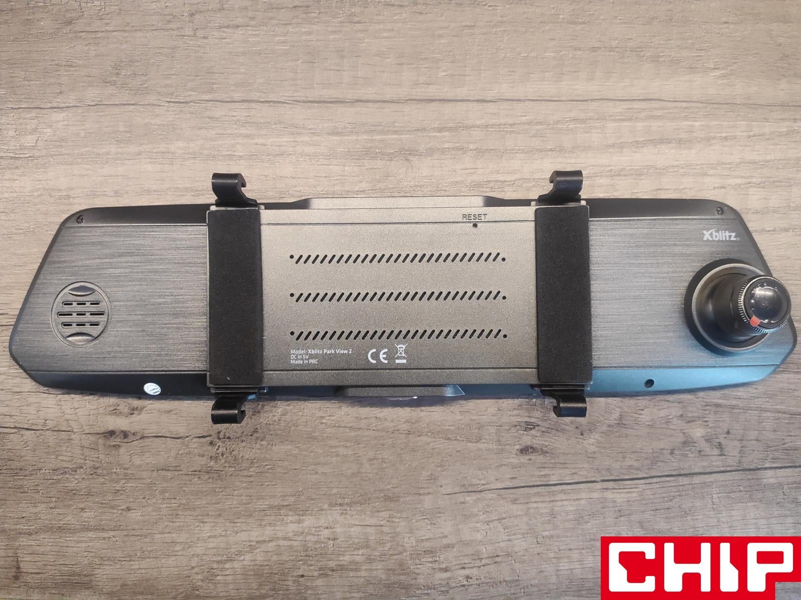 Całość mierzy 30,5 x 7,4 x 3,3 cm, więc choć grubość nie jest przesadna, to długość lusterka zdecydowanie przewyższy długość tego, którego macie w samochodzie, ale już kilka godzin jazdy przyzwyczai Was do nowego lusterka. Zwłaszcza że z punktu widzenia kierowcy nie sprawia wrażenia wideorejestratora, bo prawdziwy charakter Park View 2 widać tylko z zewnątrz przez spory obracany w dosyć szerokim zakresie obiektyw. Na tyle znalazł się też przycisk fabrycznego resetu i głośnik, jak również szereg otworów wentylacyjnych między widełkami montażu gumek.