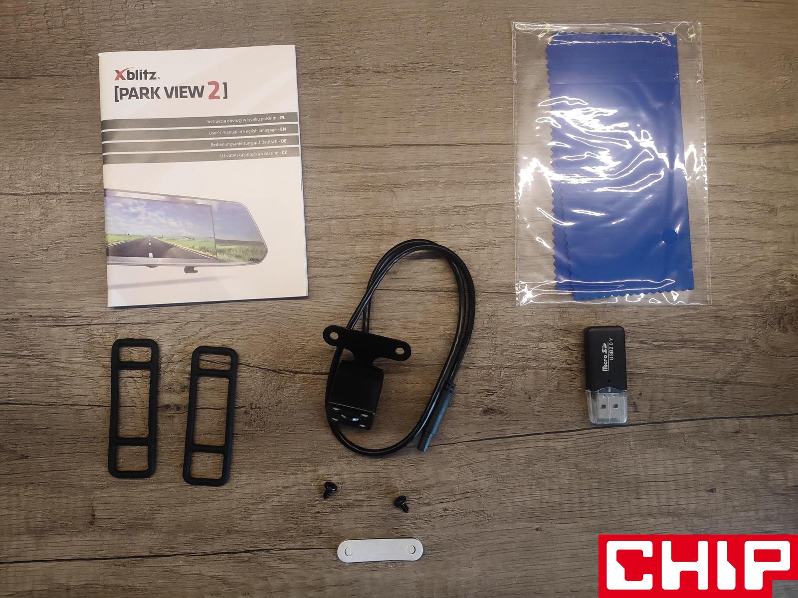 Park View 2 trafia do nas w twardym kartonowym pudełku, którego obwoluta od razu przynosi na myśl produkt Xblitz swoim charakterystycznym wyglądem. Wewnątrz oprócz zabezpieczonego foliami wideorejestratora i lusterka wewnętrznego w jednym znajdziemy dwa gumowe klipsy montażowe (do naciągnięcia na zintegrowane w kabinie lusterko), długi samochodowy przewód zasilający miniUSB, ponad 5-metrowy przewód dla dołączonej kamerki tylnej, samą kamerkę tylną i zestaw do jej montażu (taśma dwustronna + dwie śrubki).