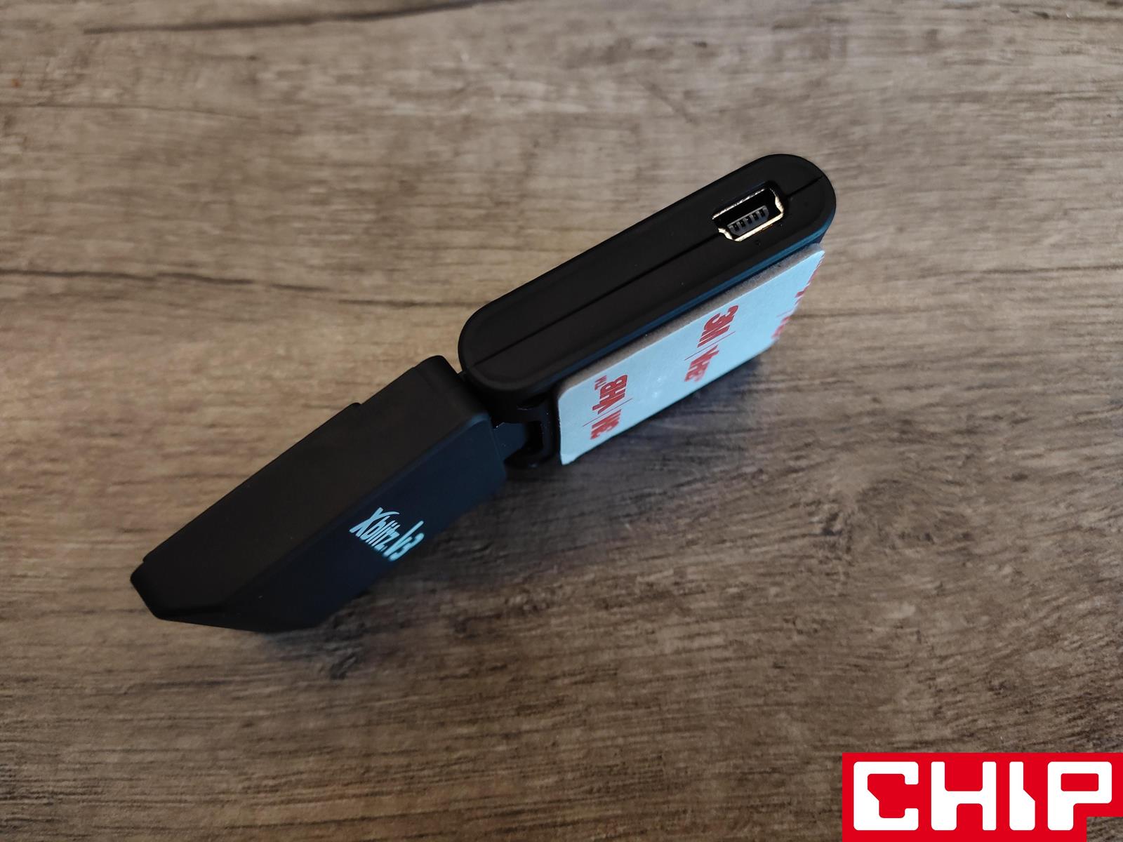 Xblitz V3 4K Magnetic wygląda tradycyjnie i na pierwszy rzut oka nie wyróżnia się na tle innych wideorejestratorów, sprowadzając się do prostopadłościanu z zaokrąglonymi rogami o wymiarach 50 x 90 x 41 mm. Na przodzie znalazł się umieszczony po lewej stronie obiektyw, który zrobił z drugiej strony miejsce zarówno głośnikowi ukrytemu pod pięcioma dziurkami, jak i sekcji magnetycznej do połączenia wideorejestratora z uchwytem przyklejonym do szyby samochodowej. Ten posiada własne gniazdo miniUSB do zasilania w samochodzie.