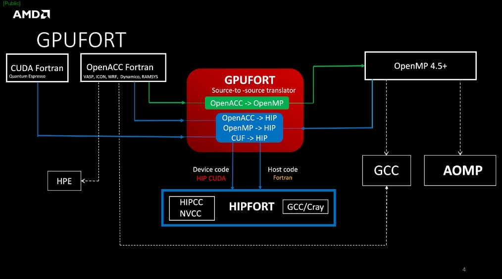 Dlatego też GPUFORT obsługuje tłumaczenie kodu źródłowego CUDA Fortran i kodu Fortran opartego na OpenACC do OpenMP 4.5+. Warto jednak podkreślić, że na ten moment nie jest on w żadnym stopniu kompilatorem, a czymś w rodzaju projektu badawczego. Obecnie przyjmuje postać kodu napisanego w Pythonie, który zajmuje się całym procesem tłumaczenia kodu, ale nie jest idealny i może nie radzić sobie dobrze. Zgłaszają to sami inżynierowie AMD, wskazując, że GPUFORT nie stworzy w pełni działających, zautomatyzowanych systemów konwersji, wymagając ręcznych, żmudnych poprawek.