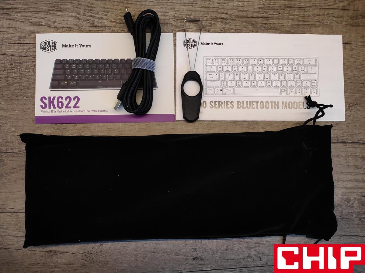 W środku czeka na nas klawiatura chroniona dodatkowo przyjemnym w dotyku, materiałowym workiem z myślą o transporcie, solidny, dosyć sztywny przewód USB-A do USB-C w materiałowym oplocie, instrukcja co do nawiązania połączenia Bluetooth, karta produktu i prosty kluczyk do ściągania klawiszy z przełączników.