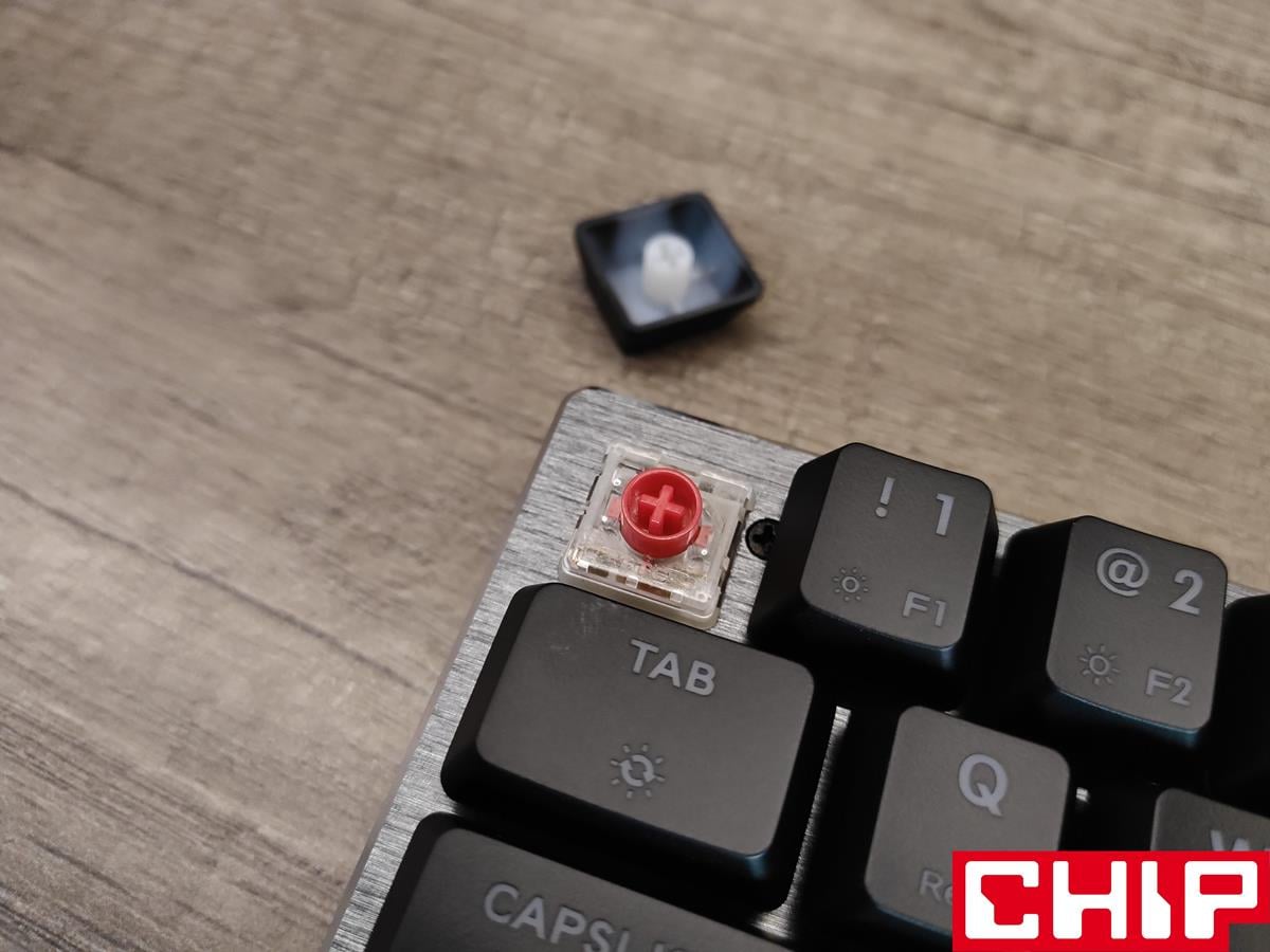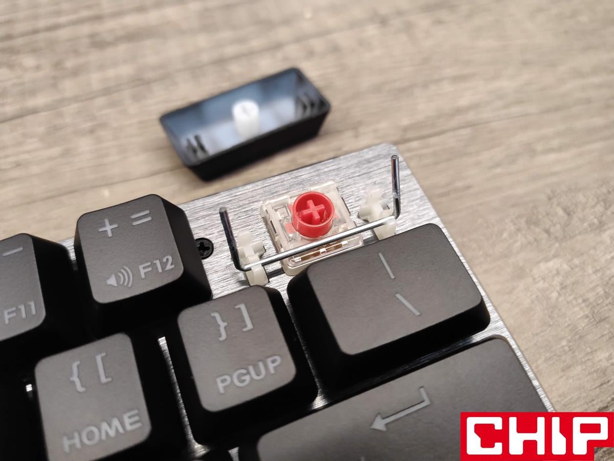 Jeśli z kolei idzie o przełączniki, SK622 można kupić z przenikami niskoprofilowymi TTC w wersji Blue, Brown i Red, która właśnie trafiła do mnie na testy. Cechuje je wytrzymałość 50 mln aktywacji, oczywiście liniowy charakter działania, około 45 gramów wymaganej siły do wciśnięcia przełącznika i naturalnie skrócony do 3,2 mm zakres działania, który aktywacje odnotowuje już po pokonaniu 1,2 mm.