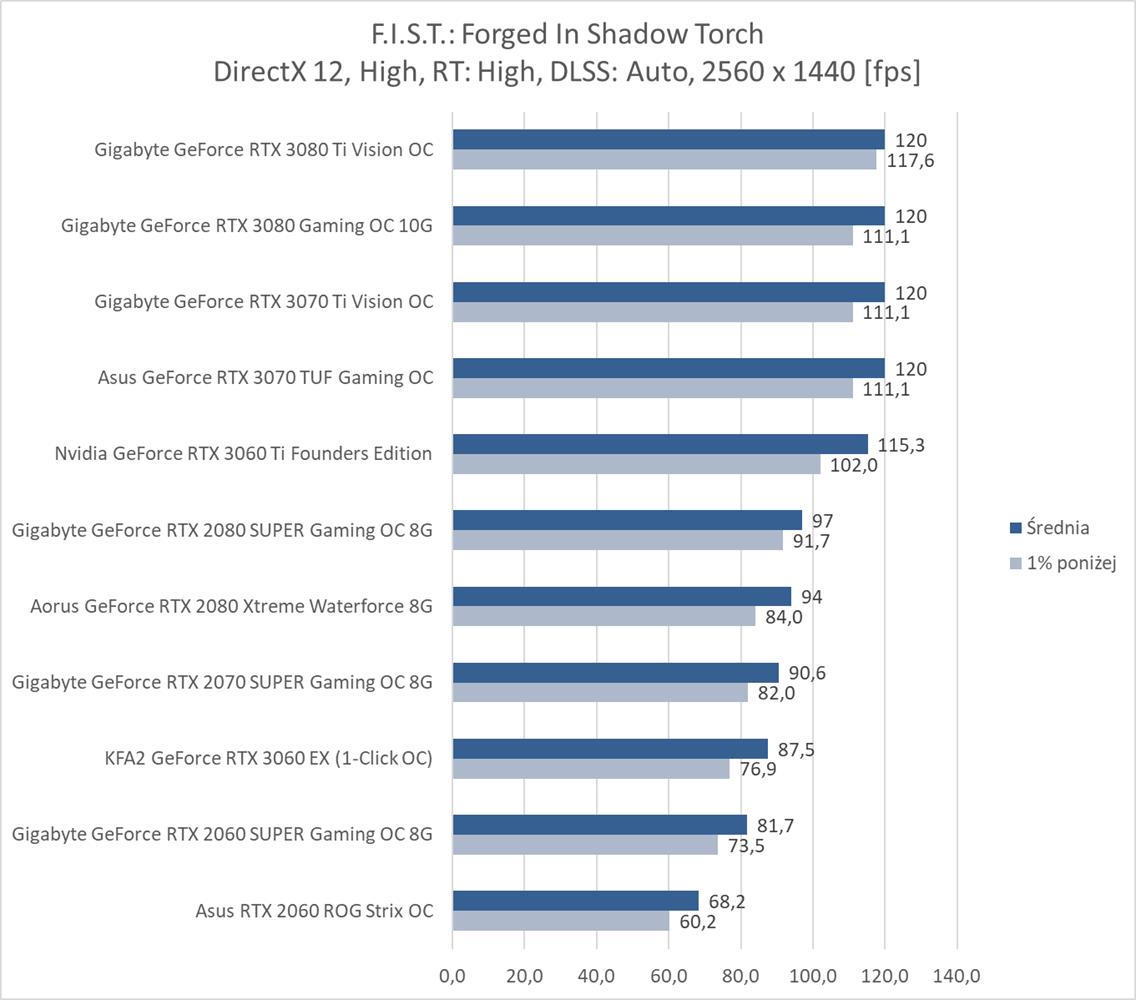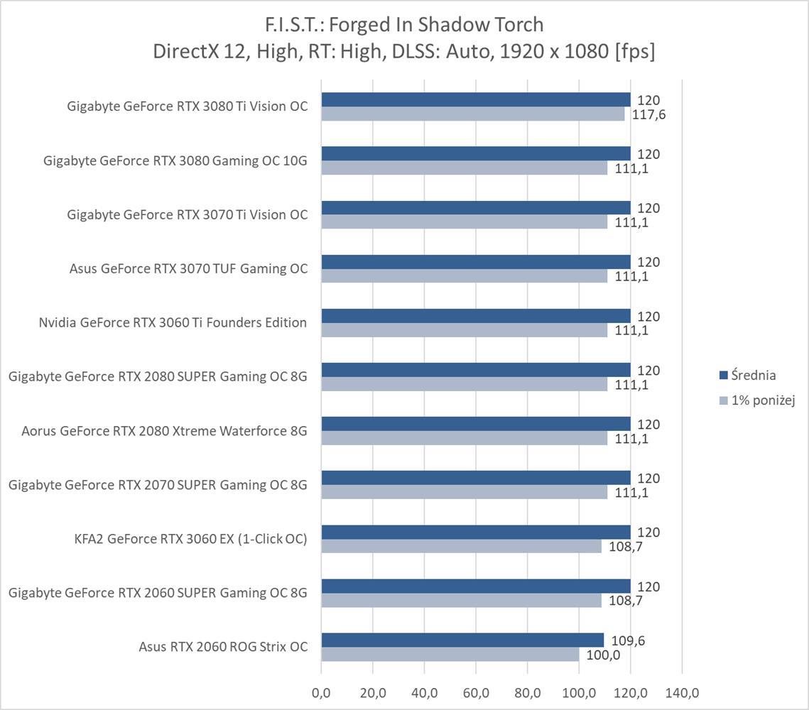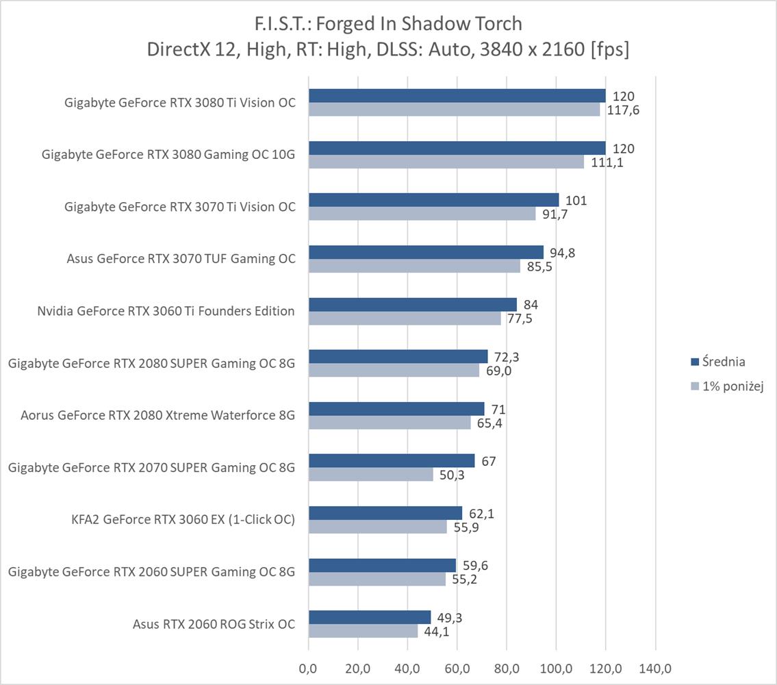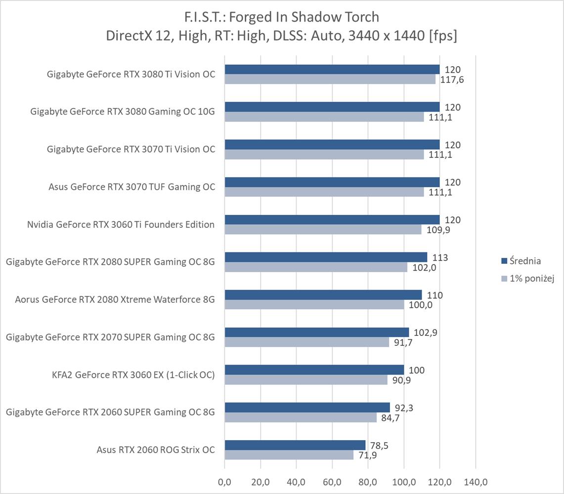 F.I.S.T.: Forged In Shadow Torch okazuje się niezbyt wymagającym tytułem dla kart graficznych. Bez RT i DLSS na każdym z modeli możecie płynnie grać w rozdzielczości 1920 x 1080, a do uzyskania 60 fps w 3840 x 2160 wystarczy już RTX 2070 SUPER. Włączenie RT powoduje bardzo mocny spadek fps, ale na pomoc przychodzi tutaj DLSS, który zapewnia płynną rozgrywkę na większości kart graficznych nawet w najwyższej rozdzielczości. Do dyspozycji mamy jednak tylko tryb auto, który np. w 3440 x 1440 zapewnia większa ilość fps niż w 2560 x 1440 – musi tutaj działać w innym trybie. Szkoda, że twórcy jednak nie dodali możliwości wyboru Quality, Performance itp..