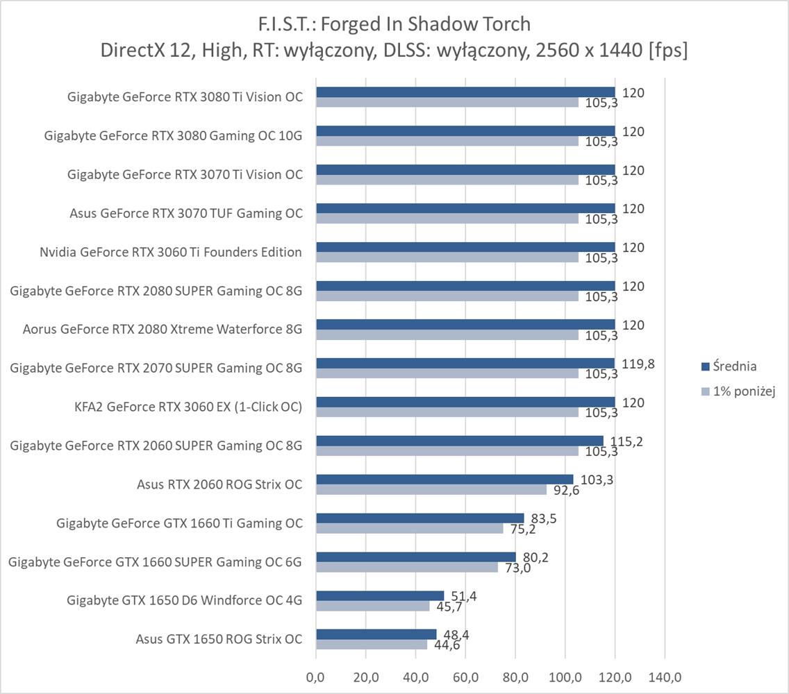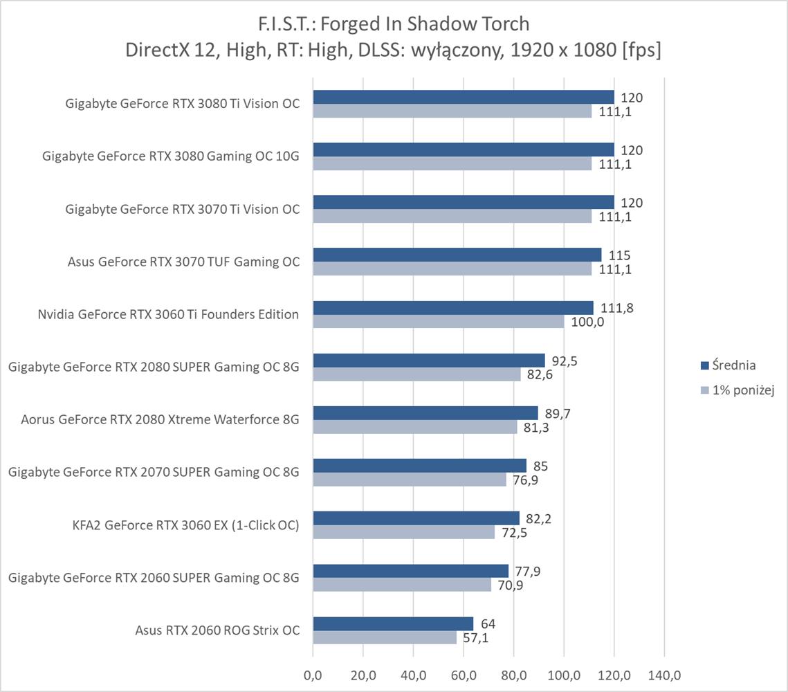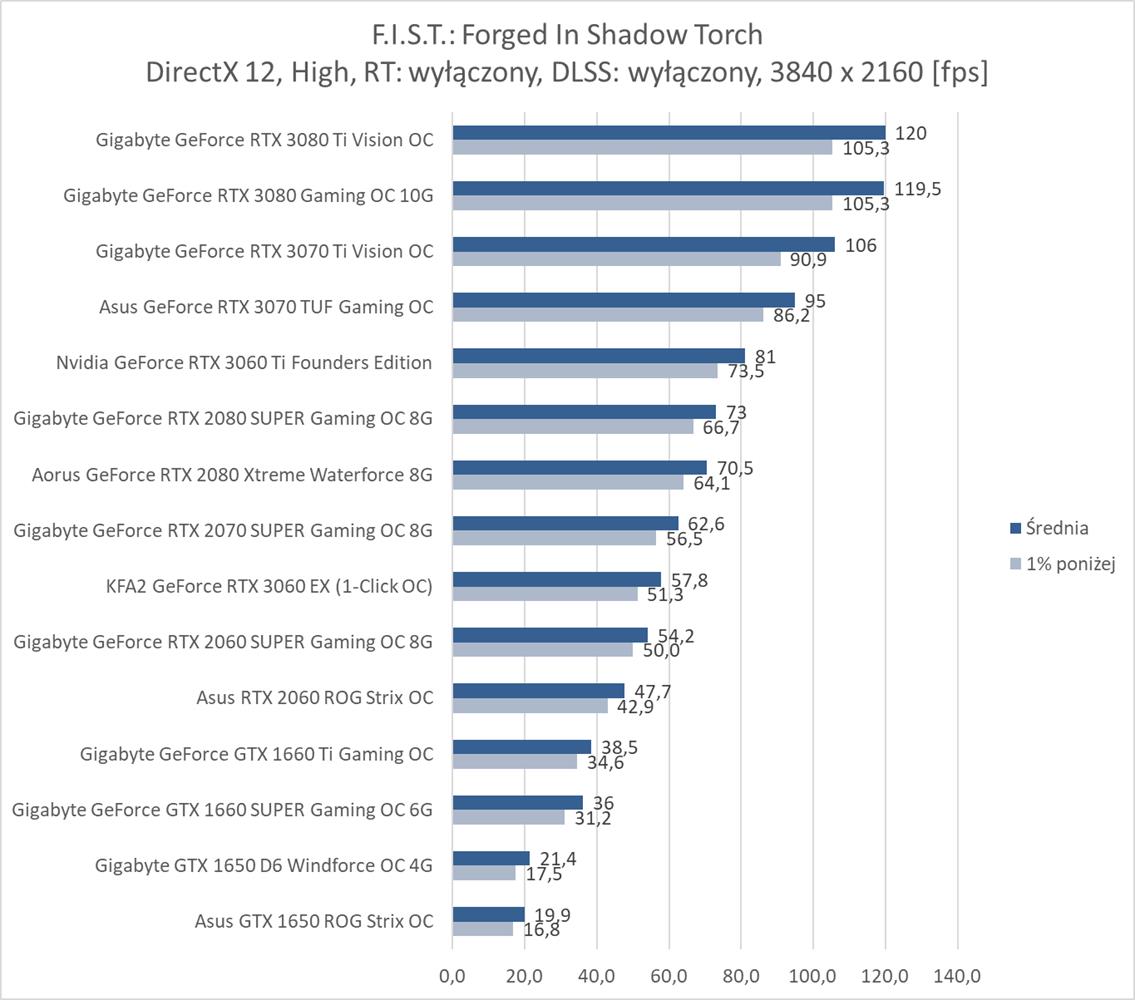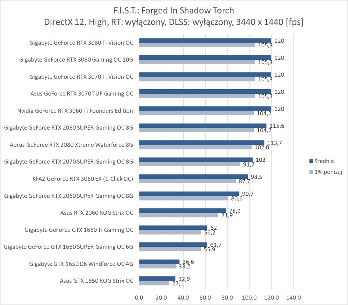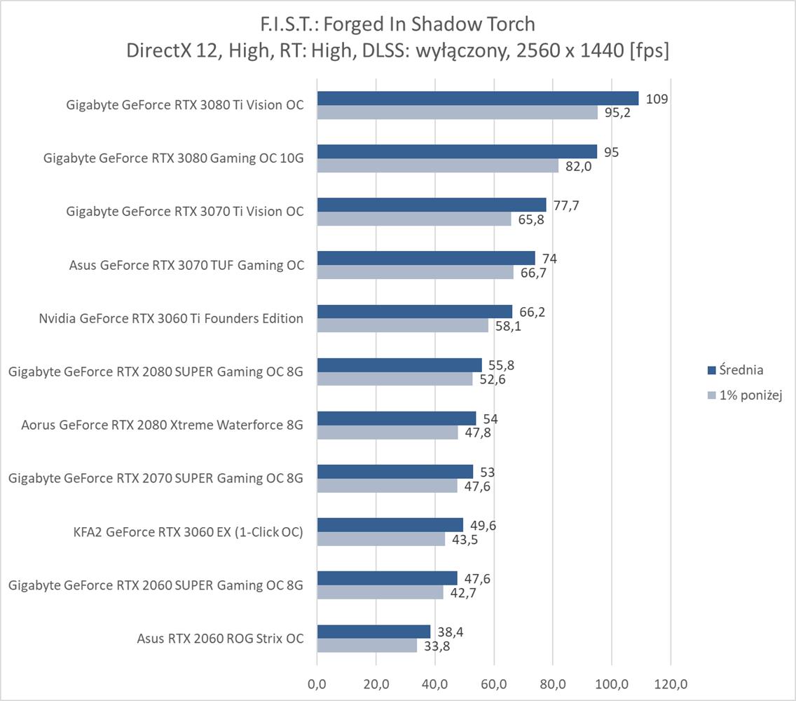 F.I.S.T.: Forged In Shadow Torch okazuje się niezbyt wymagającym tytułem dla kart graficznych. Bez RT i DLSS na każdym z modeli możecie płynnie grać w rozdzielczości 1920 x 1080, a do uzyskania 60 fps w 3840 x 2160 wystarczy już RTX 2070 SUPER. Włączenie RT powoduje bardzo mocny spadek fps, ale na pomoc przychodzi tutaj DLSS, który zapewnia płynną rozgrywkę na większości kart graficznych nawet w najwyższej rozdzielczości. Do dyspozycji mamy jednak tylko tryb auto, który np. w 3440 x 1440 zapewnia większa ilość fps niż w 2560 x 1440 – musi tutaj działać w innym trybie. Szkoda, że twórcy jednak nie dodali możliwości wyboru Quality, Performance itp..