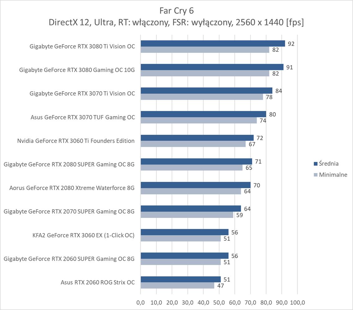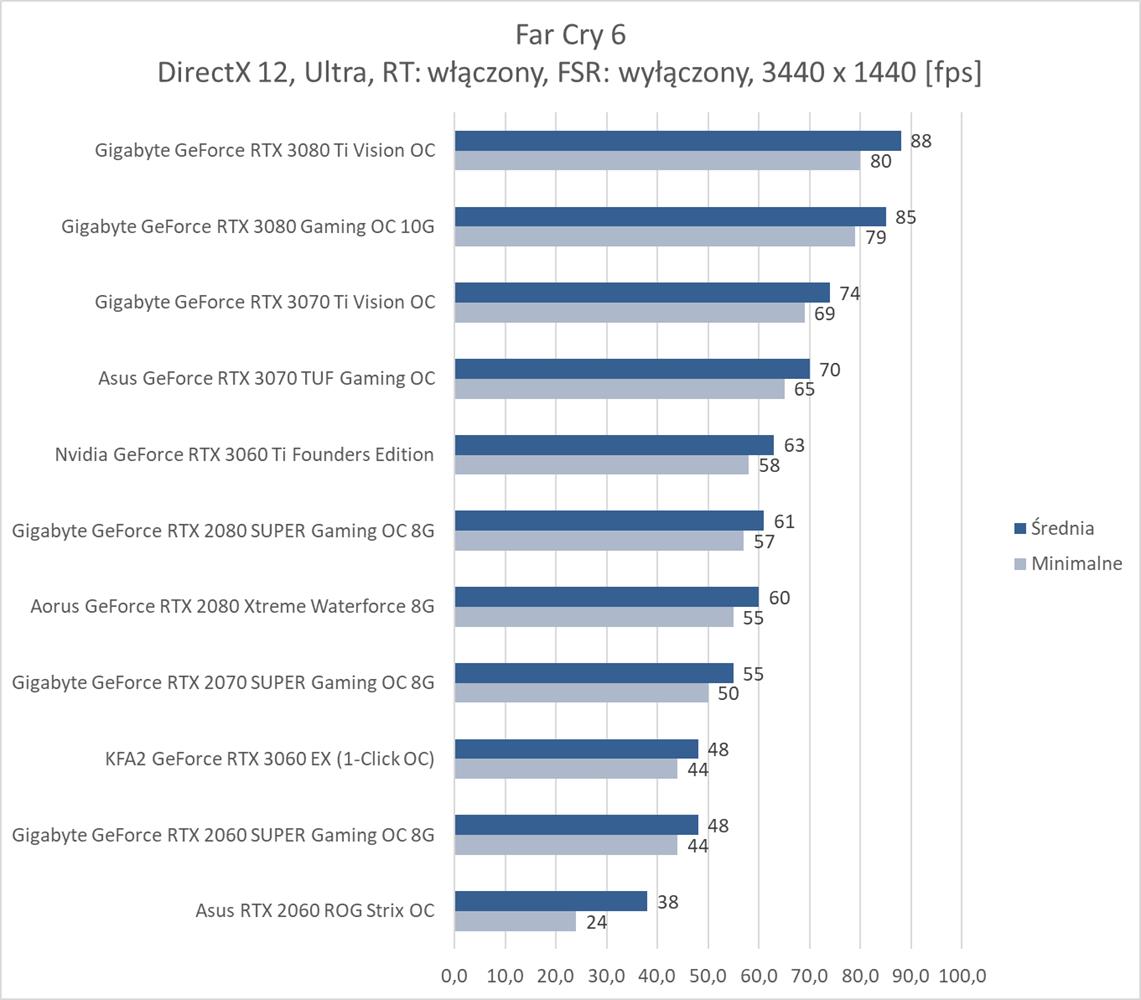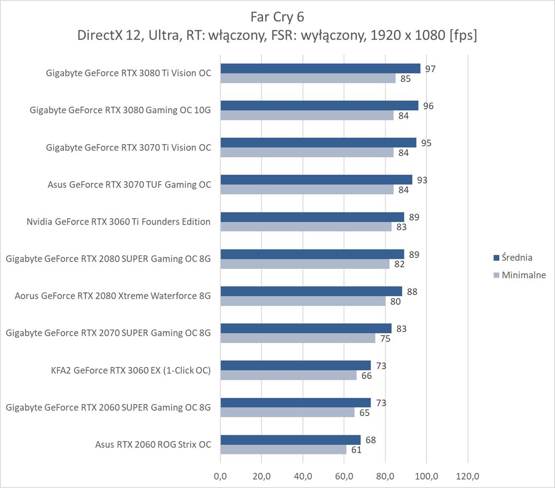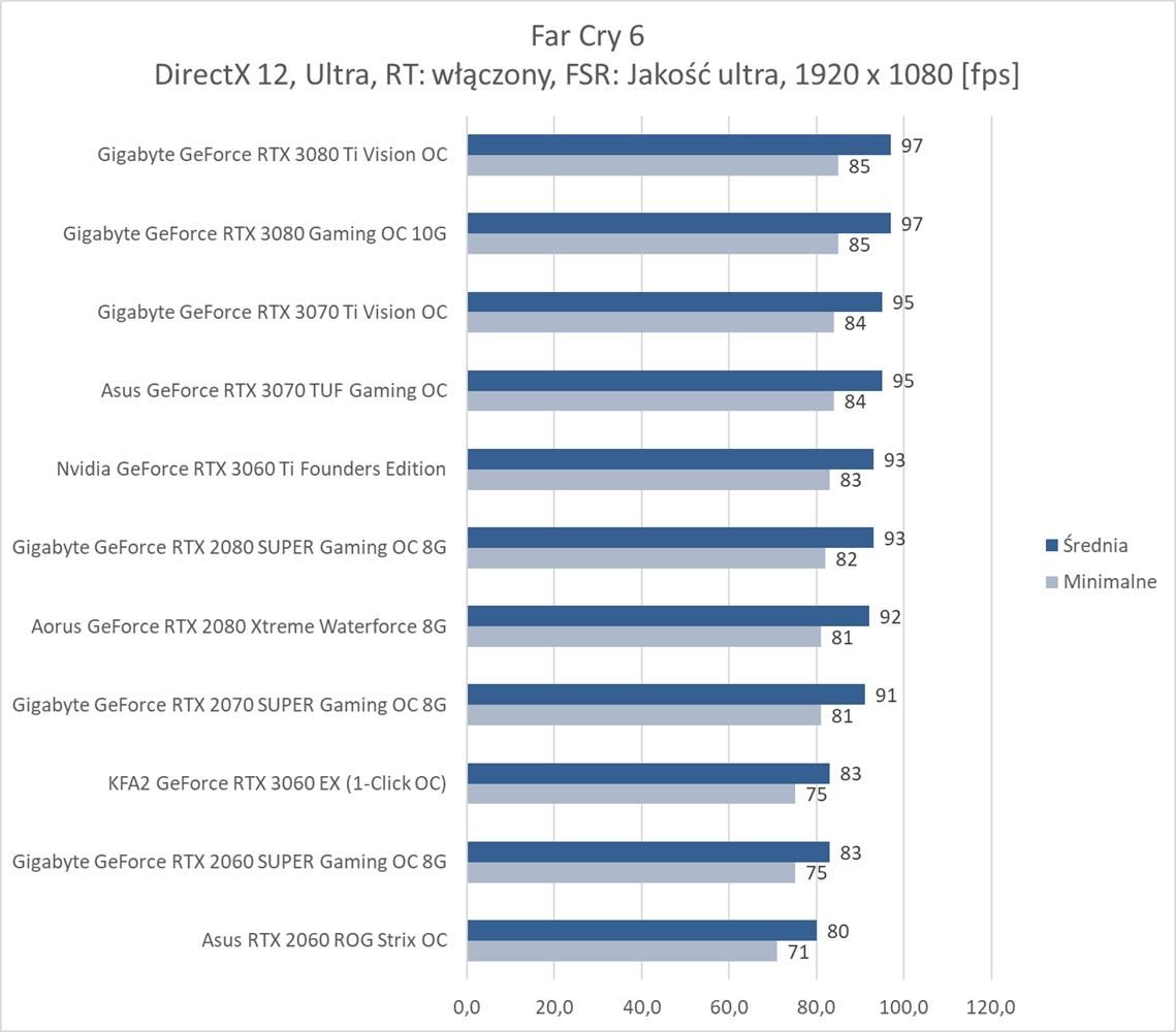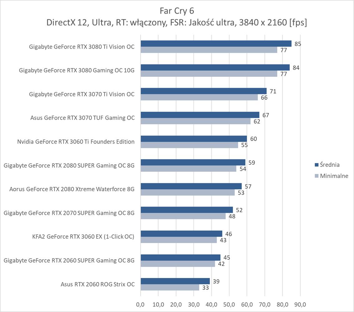 W ostatniej z rozdzielczości bez RT średnio 60 fps zapewnia RTX 3070, co jest bardzo dobrym wynikiem. Far Cry 6 nie jest więc aż tak wymagający jakby się mogło wydawać. Natomiast karty z pamięcią poniżej 8 GB kompletnie sobie nie radzą i notują poniżej 10 fps. Włączenie RT niestety eliminuje z zestawienia wszystkie karty mające już mniej niż 10 GB pamięci VRAM. Natomiast tutaj potrzeba i tak przynajmniej RTX 3080 do uzyskania płynnej rozgrywki. Dodanie FSR zmienia tę sytuację i wszystkie karty RTX dają radę z przejściem testu. Średnio ok. 60 fps zapewnia już RTX 2080 SUPER, co jest nadal dobrym wynikiem.