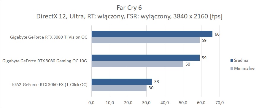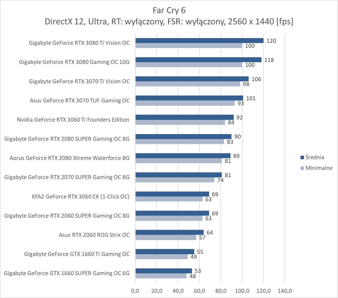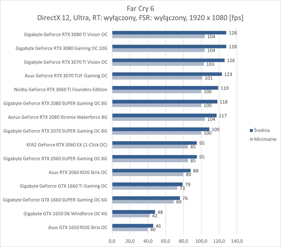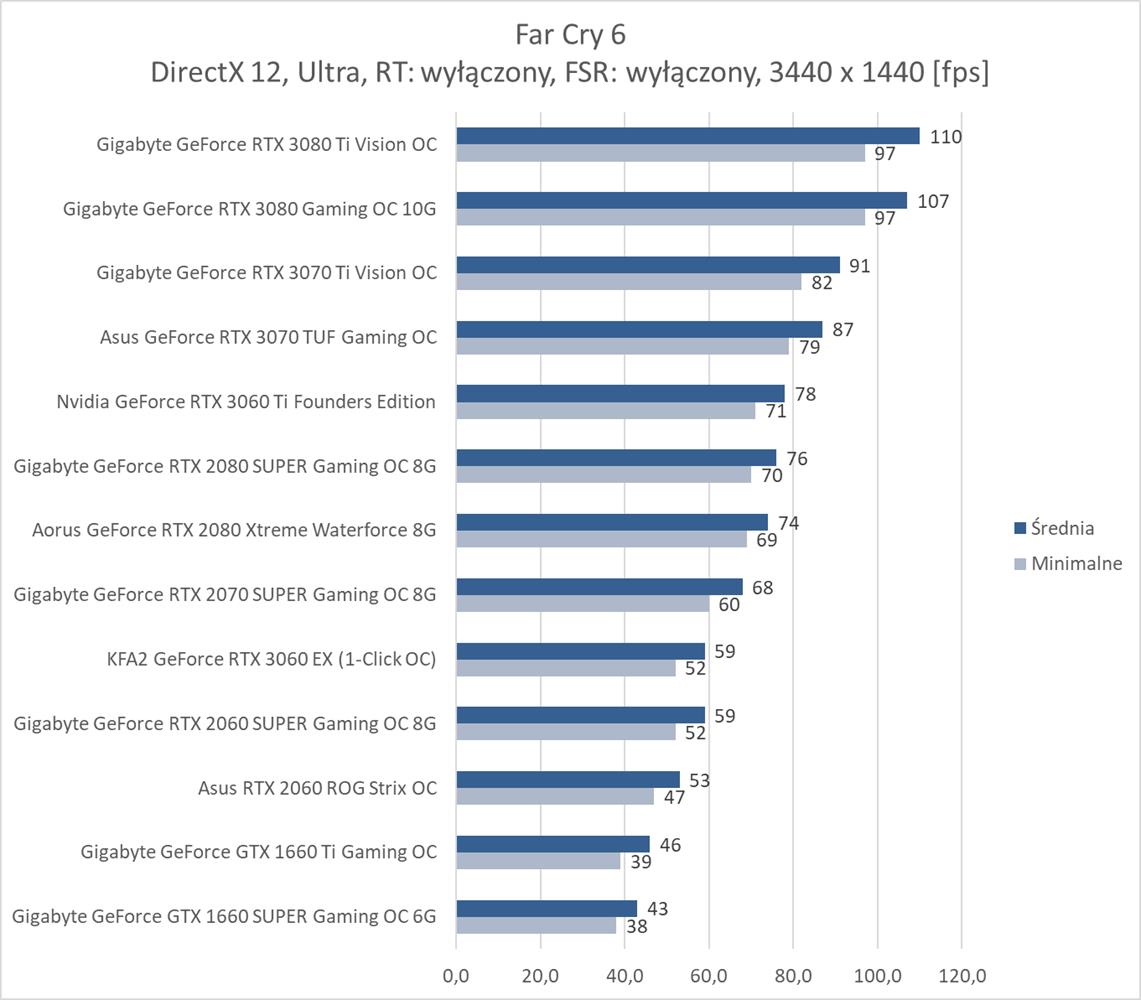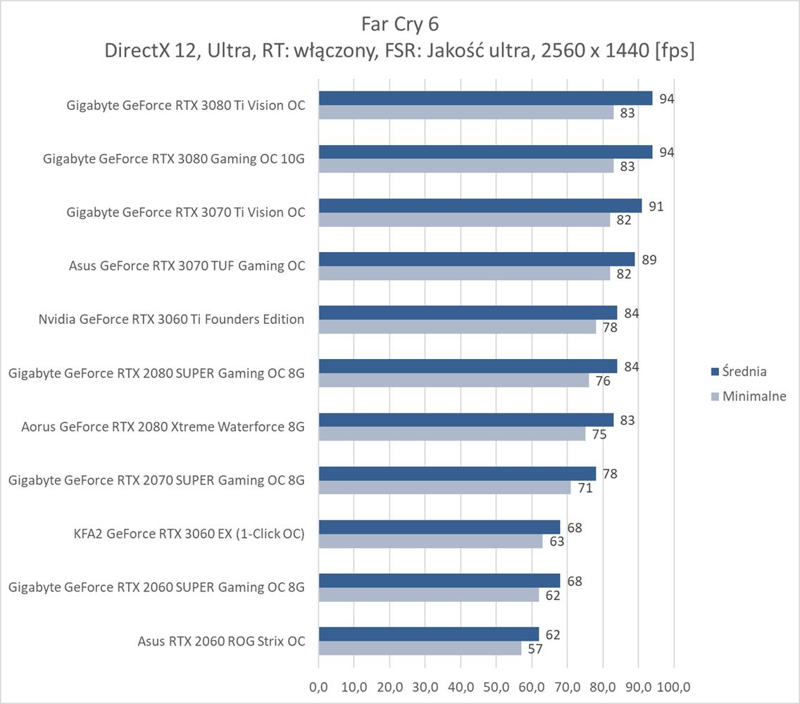 W ostatniej z rozdzielczości bez RT średnio 60 fps zapewnia RTX 3070, co jest bardzo dobrym wynikiem. Far Cry 6 nie jest więc aż tak wymagający jakby się mogło wydawać. Natomiast karty z pamięcią poniżej 8 GB kompletnie sobie nie radzą i notują poniżej 10 fps. Włączenie RT niestety eliminuje z zestawienia wszystkie karty mające już mniej niż 10 GB pamięci VRAM. Natomiast tutaj potrzeba i tak przynajmniej RTX 3080 do uzyskania płynnej rozgrywki. Dodanie FSR zmienia tę sytuację i wszystkie karty RTX dają radę z przejściem testu. Średnio ok. 60 fps zapewnia już RTX 2080 SUPER, co jest nadal dobrym wynikiem.