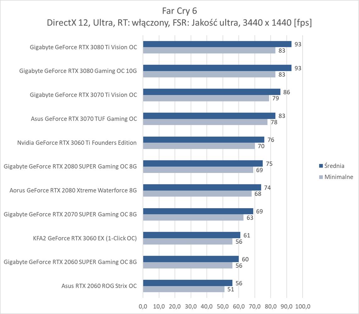W rozdzielczości 3440 x 1440 potrzeba tak naprawdę RTX 2060 SUPER/ RTX 3060, aby uzyskać średnio ok. 60 fps. Natomiast po włączeniu RTX taką ilośc klatek na sekundę zapewnia RTX 2080 w mocno podkręconej wersji. Natomiast po dodaniu FSR w trybie Jakość ultra już RTX 2060 SUPER oferuje średnio 60 fps.