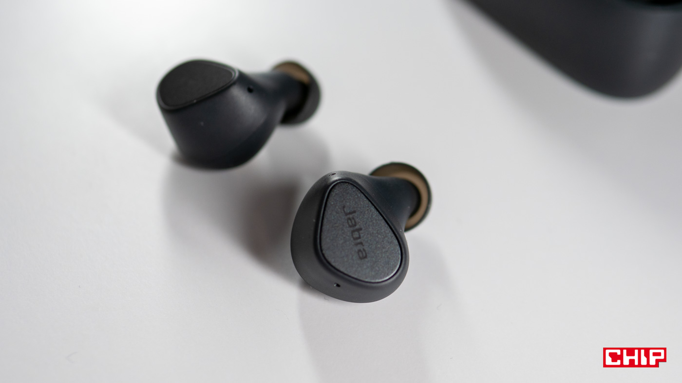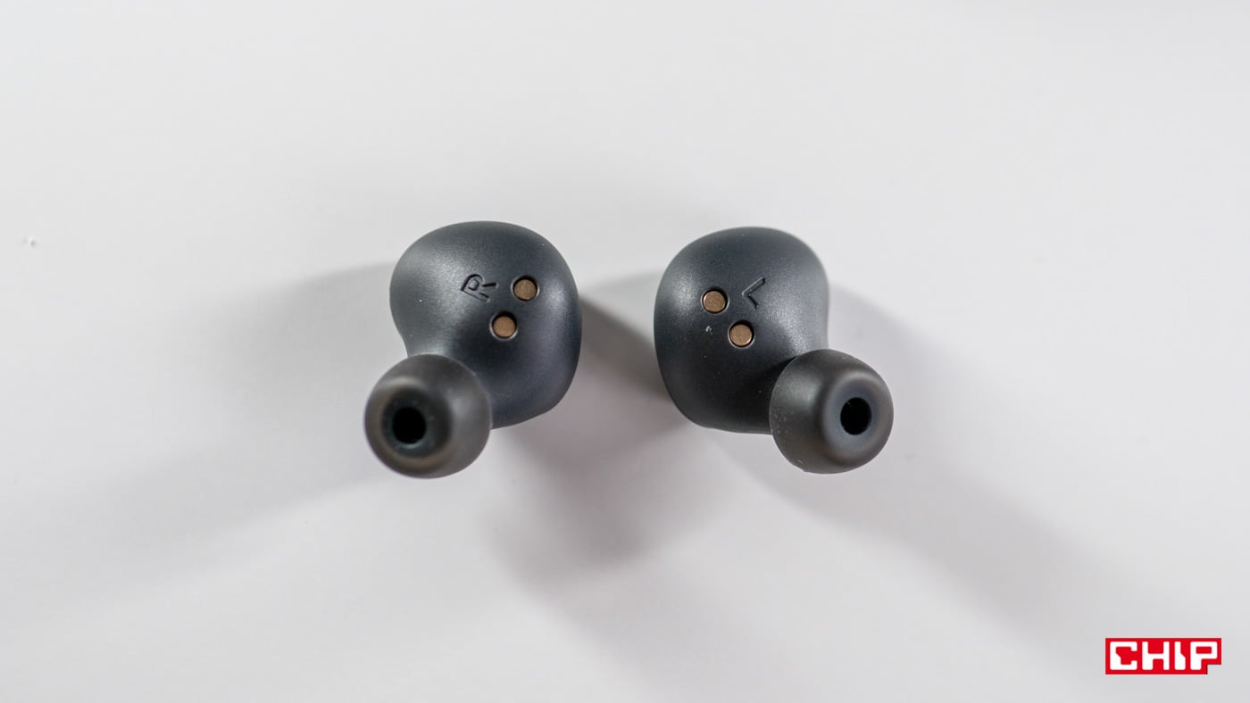 Ważące 4,6 gramów (obie ważą już 9,2 gramów) Jabra Elite 3 ewidentnie wyróżniają się na tyle innych modeli swoją trójkątną, obłą konstrukcją z zewnątrz i tradycyjnym już kształtem wewnątrz, dopasowującym się do naszego ucha. Składają się z dwuczęściowej czarnej obudowy (w testowanym warancie kolorystycznym) z widocznym łączeniem w połowie, które uzupełnia grafitowy panel z nazwą producenta na zewnątrz, pełniący również rolę przycisku sterującego. Na spodzie i na górze słuchawki znalazły się dziurki dla mikrofonów (obu słuchawkach występują łącznie cztery), a na ich wewnętrznej stronie styki do ładowania.