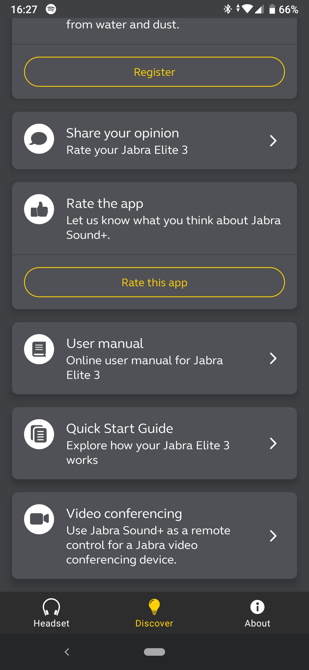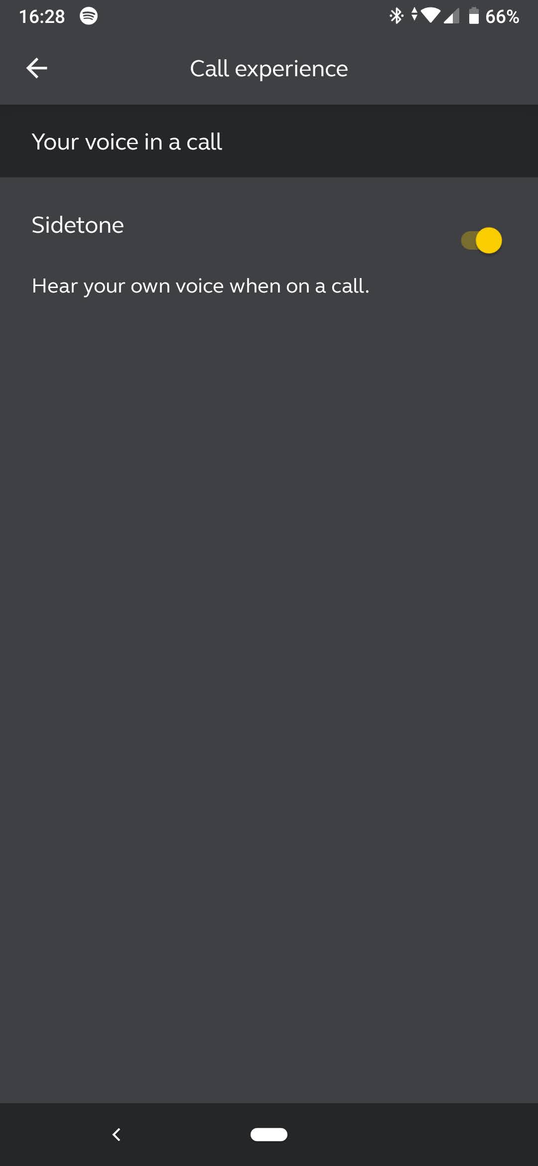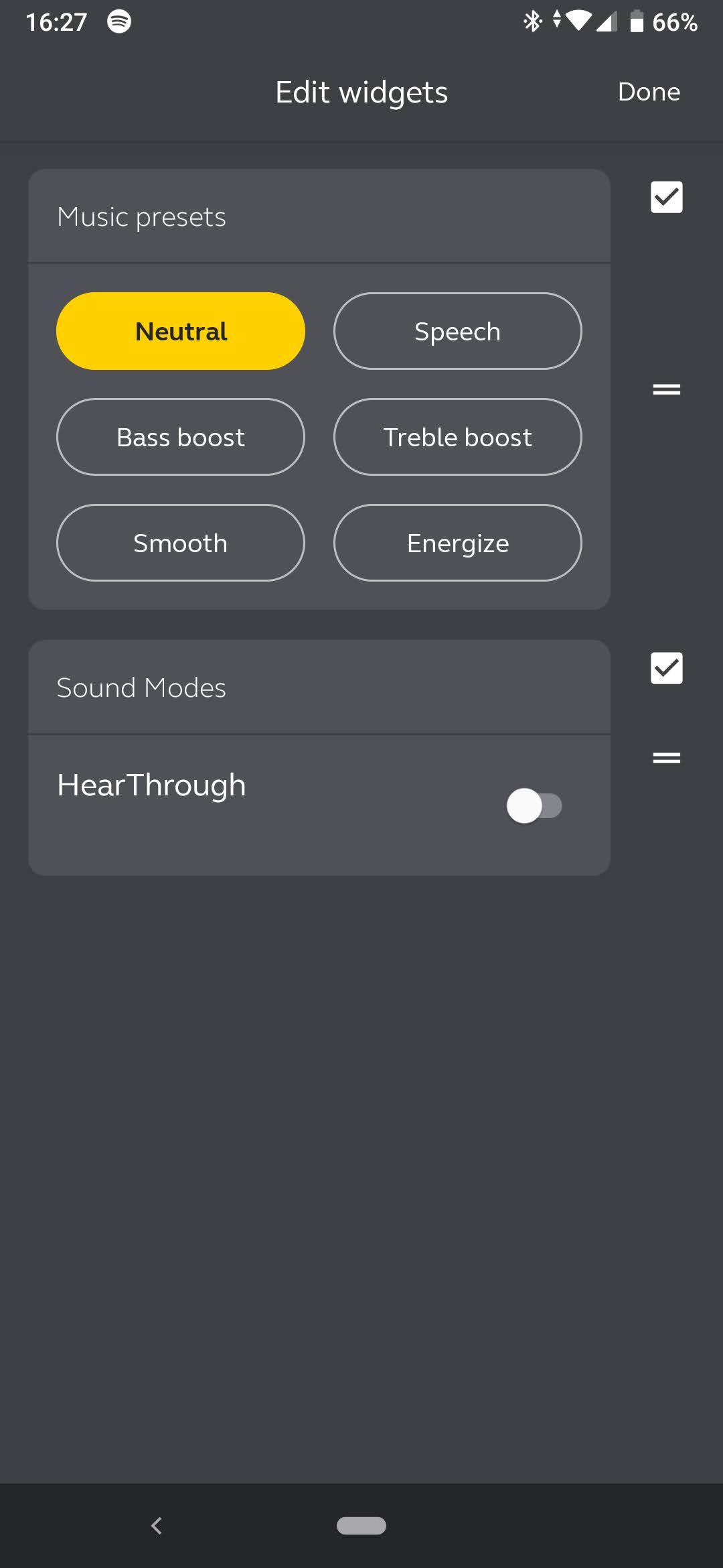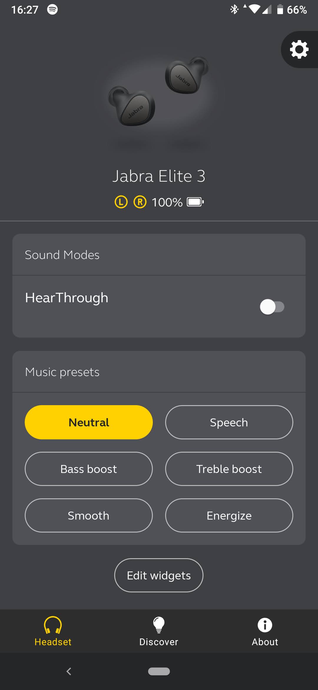 Jabra zadbała też o wsparcie aplikacji Sound+, w której możemy przeprowadzić aktualizacje firmware, czy dostosować brzmienie w formie kilku predefiniowanych profilach. Poza nimi jedną z tych ważniejszych funkcji jest możliwość aktywacji lub dezaktywacji trybu HearThrough, co i tak robimy po prostu jednym kliknięciem w przycisk. W aplikacji możemy dodatkowo podejrzeć poziom naładowania słuchawek, ale już nie samego etui, czy ustawić tryb HearThrough podczas rozmów telefonicznych.