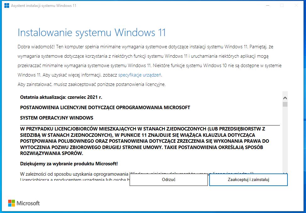 Wchodzicie na tę stronę Microsoftu i pobieracie asystent instalacji systemu Windows 11. On pokaże Wam, że PC jest zgodny z Windows 11 jeśli narzędzie do sprawdzania kondycji komputera również Wam to pokazuje – to co pisze (lub czego nie ma) w aktualizacjach nie ma znaczenia.