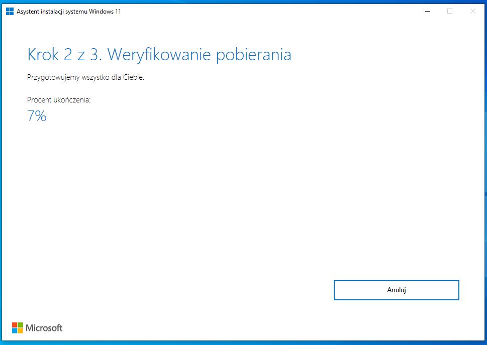 Następnie musicie przejść przez 3 kroki: pobieranie, weryfikowanie i instalowanie. Tutaj nic nie trzeba klikać, po prostu cierpliwie czekacie. Nie przejmujcie się, że instalator staje na jakimś procencie. U mnie np. dosyć długo był na 0%. W między czasie możecie bez problemów korzystać z PC.