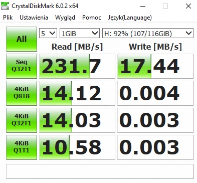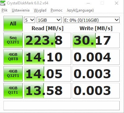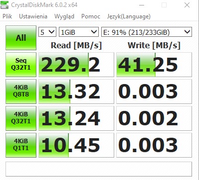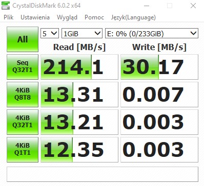 Graniczne zapełnienie obu pendrive’ów nie rzutuje z kolei zauważalnie negatywnie na wydajność. Testy zresztą wskazują, że w grę wchodzi tak naprawdę błąd pomiarowy, co potwierdzają momentami wyższe wyniki po zapełnieniu. Bez względu na wszystko, oba nośniki wykazują bardzo słabe wyniki przy operacjach z udziałem zapisu próbek losowych, co sprawia, że zapis na nich trwa znacznie dłużej od odczytu.