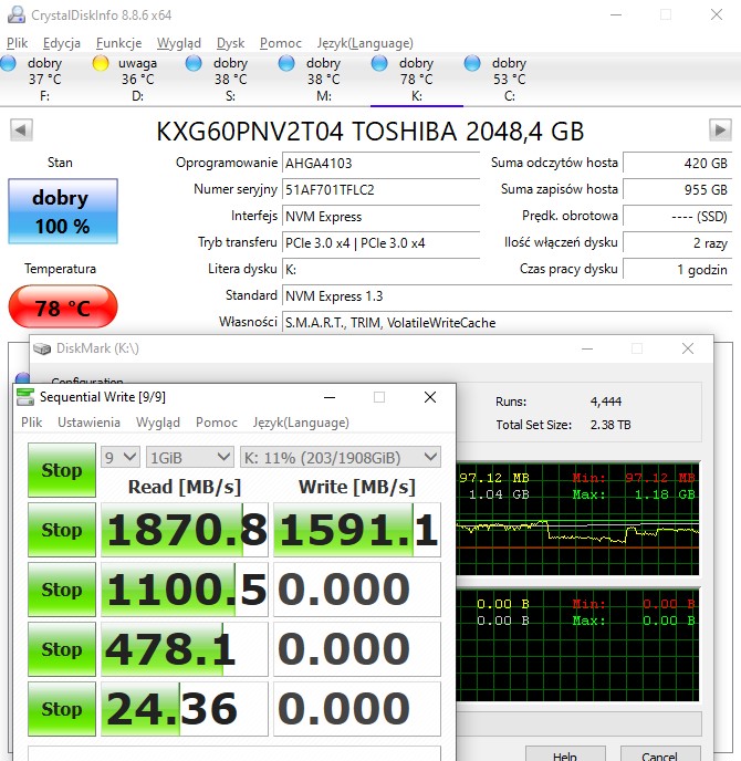 Jednak po wrzuceniu dyskowi całej masy zadań, temperatury dobijają do nawet 78 stopni, co nie tyle sugeruje, co nakazuje rozsądkowi zadbać o przynajmniej prosty aluminiowy radiator, który z nawiązką poradzi sobie z tym problemem.