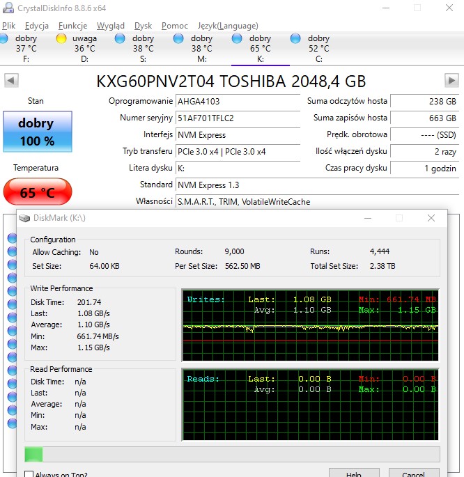 Chociaż po Kioxia XG6-P nie spodziewałem się problemu z temperaturami przez interfejs PCIe 3.0×4, to ten i tak wystąpił, co potwierdziły okazjonalne odczyty rzędu 70/71 stopni Celsjusza podczas testów. Wymaga to jednak znacznego obciążenia dysku, co potwierdza to, że postawienie wyłącznie na syntetyczny stress-tess rozgrzewa Kioxia XG6-P do ledwie 65 stopni. Z kolei w spoczynku ten nośnik pracuje na temperaturze około 50 stopni.