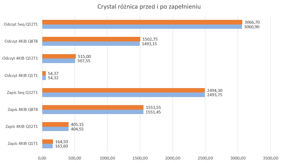 11-procentowe zapełnienie 2 TB dysku Kioxia XG6-P powoduje delikatny, bo mieszczący się w 1%, spadek wydajności. Nic dziwnego, patrząc po tym, że bufor TLC-SLC nie jest zbyt okazały, co pokazały wykresy kopiowania powyżej.