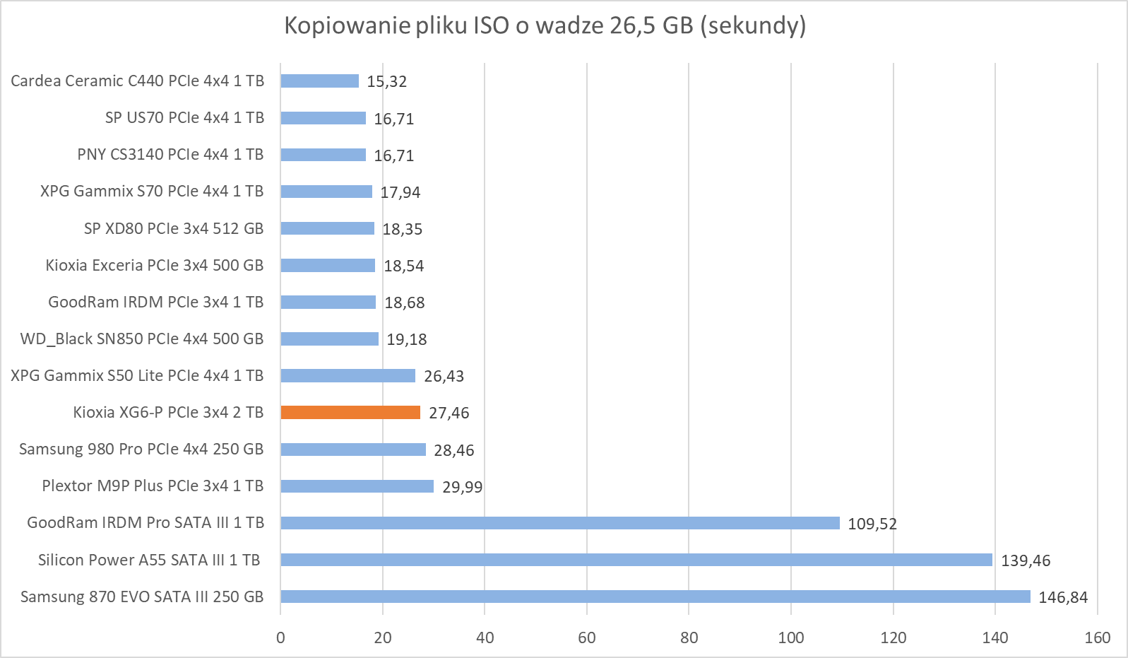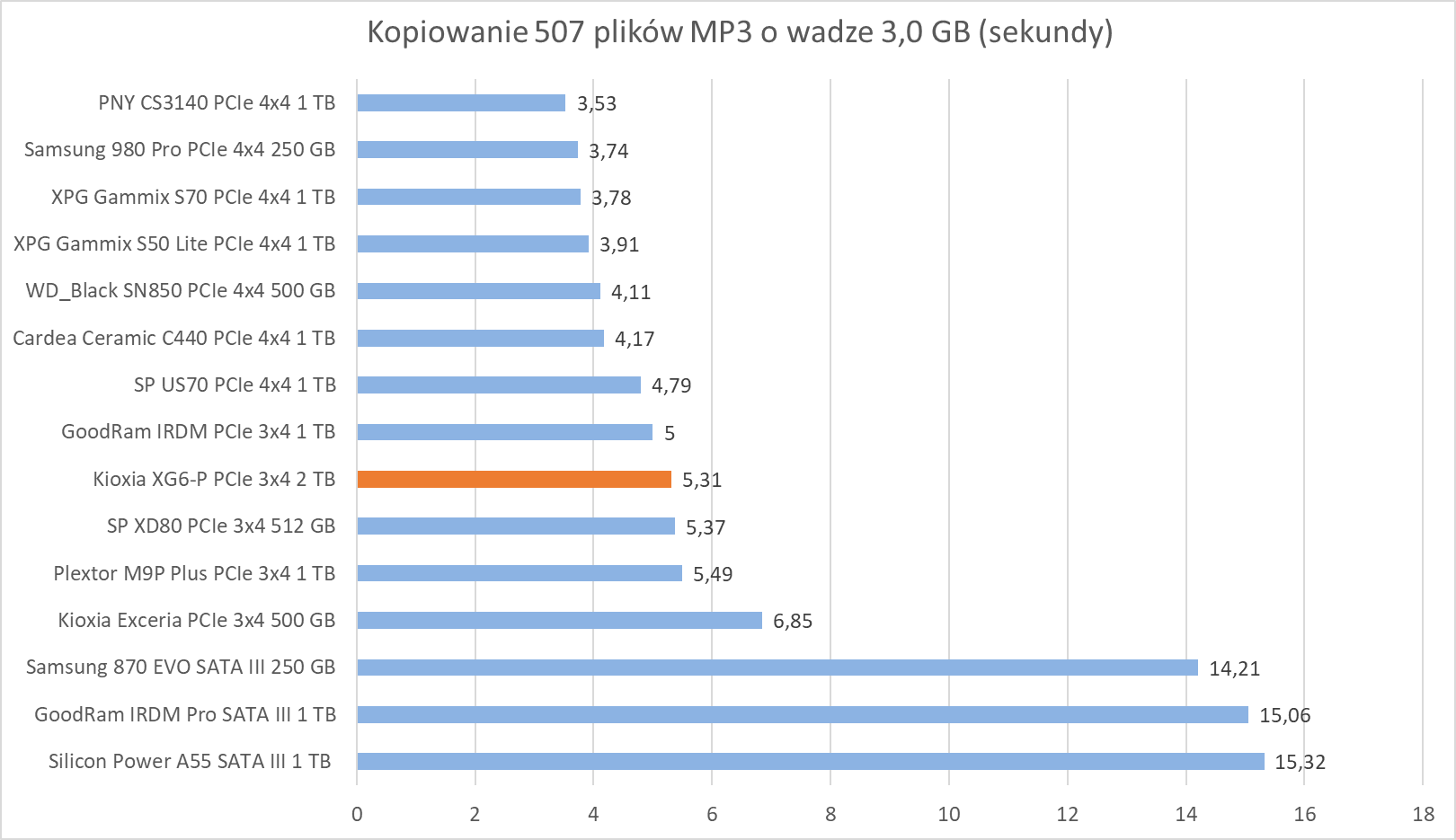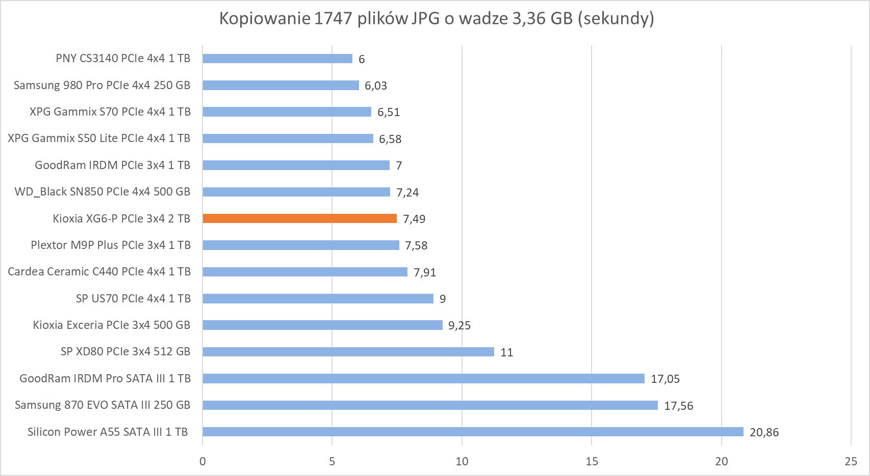 Co jednak ciekawe, w testach związanych z kopiowaniem plików, Kioxia XG6-P nie wypadł aż tak źle, co widać zwłaszcza przy kopiowaniu paczki zdjęć .jpg, czyli formacie bezstratnym..
