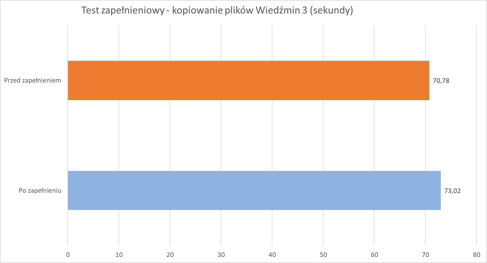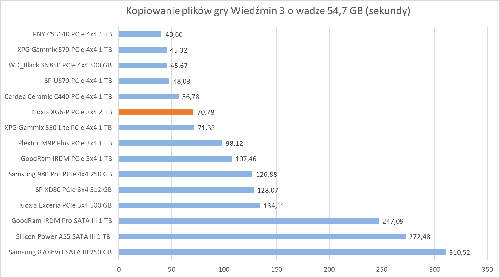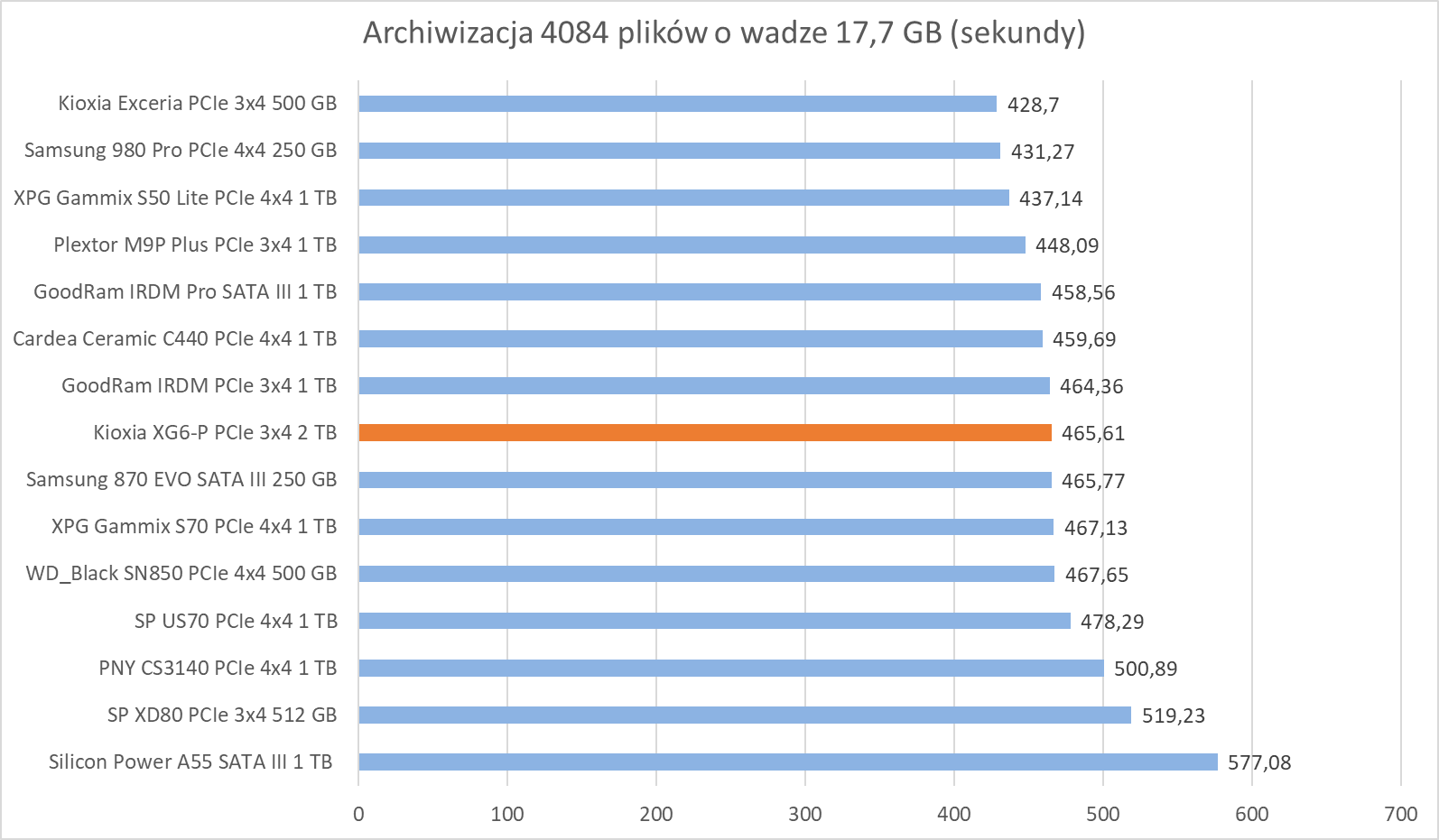 Wybierając do sprawdzianu wielozadaniowości Kioxia XG6-P dwa zadania, postawiłem na kopiowanie plików gry Wiedźmin i archiwizację. Wynik? Wydłużenie kopiowania o 18 sekund i archiwizacji o 15 sekund, co finalnie zaoszczędza nam około 55 sekund.