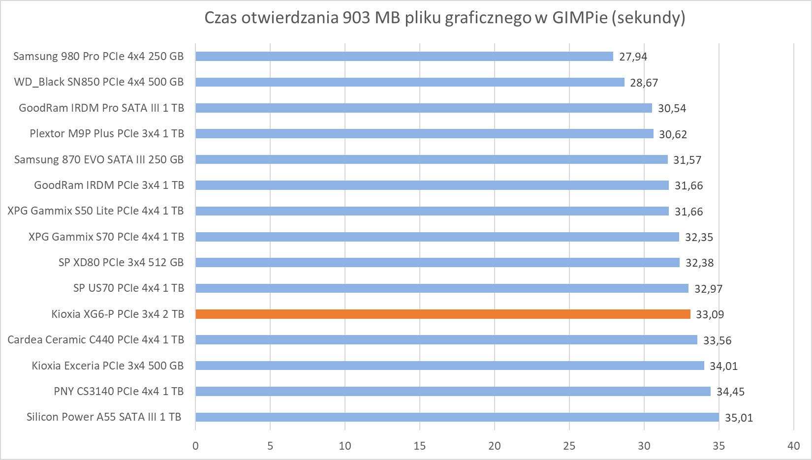 Spodziewany poziom wydajności Kioxia XG6-P nie zaskakuje również w codziennych typowych operacjach. Wypada w nich po prostu przeciętnie, ale patrząc po różnicach względem często znacznie wydajniejszych dysków “na papierze”, nie jest aż tak źle.