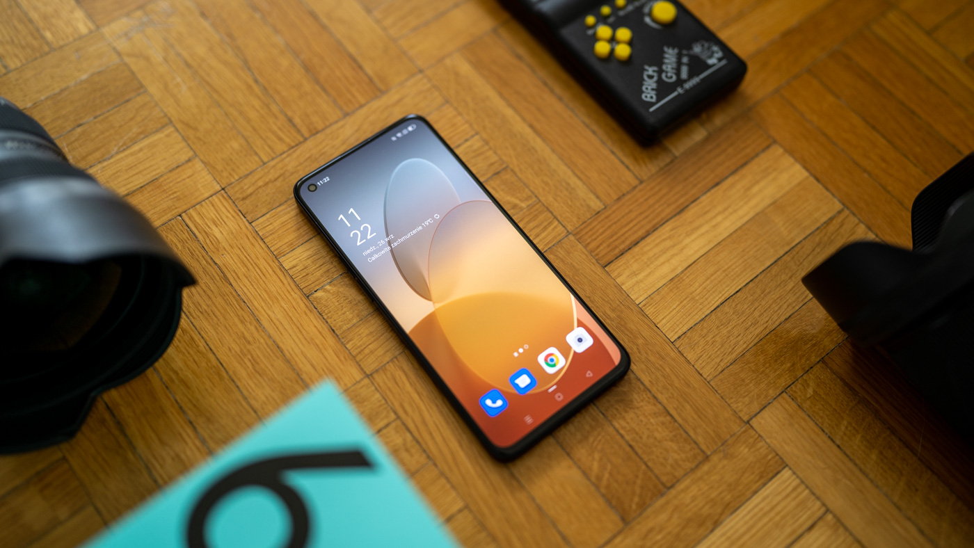 Specyfikacja? Jest dobrze. Mamy tu ekran AMOLED o przekątnej 6,43 cala (nie za duży) z 90Hz odświeżaniem obrazu, wydajny układ MediaTek Dimensity 900 w parze z 8 GB pamięci RAM oraz szybkie ładowanie SuperVOOC 2 o mocy 65W. Co znacznie skraca czas ładowania akumulatora o pojemności 4300 mAh. Znacznie oznacza w praktyce 29 minut(!).